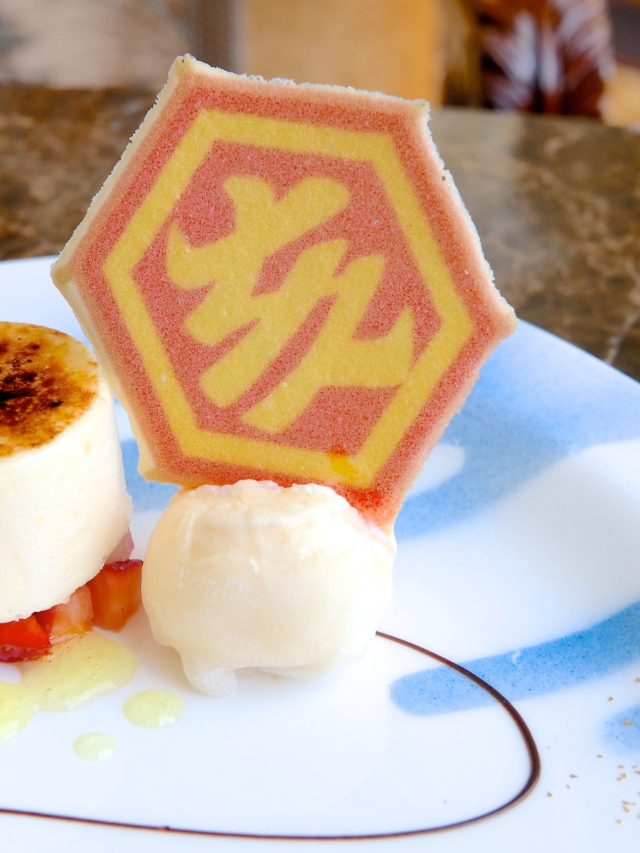 - デザート ・抹茶のタルト ・レモンシブースト ・西京味噌のマカロン ・バニラアイス 求肥包み ・豆乳ブランマンジェとイチゴのソース