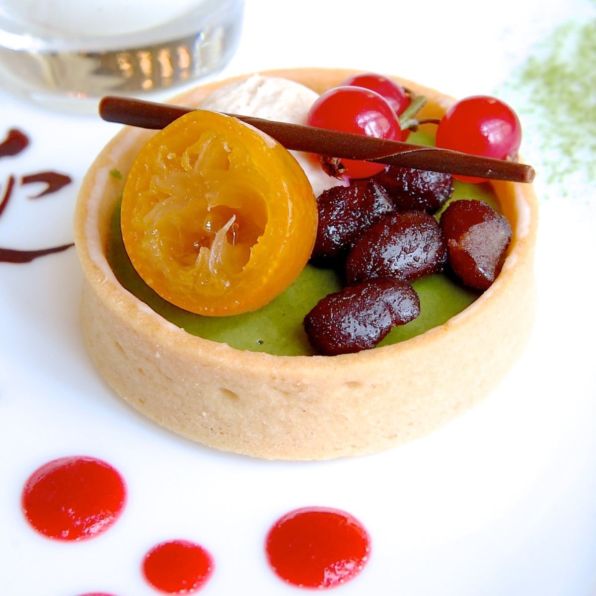 サクサクのタルトには濃厚な抹茶のクリームの上に銀杏、小豆、スグリなど鮮やかなトッピングが☆