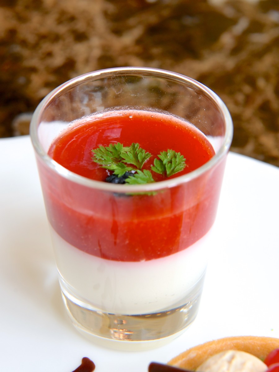 さっぱりといただける豆乳のブランマンジェとストロベリーソースの紅白なグラスデザート。