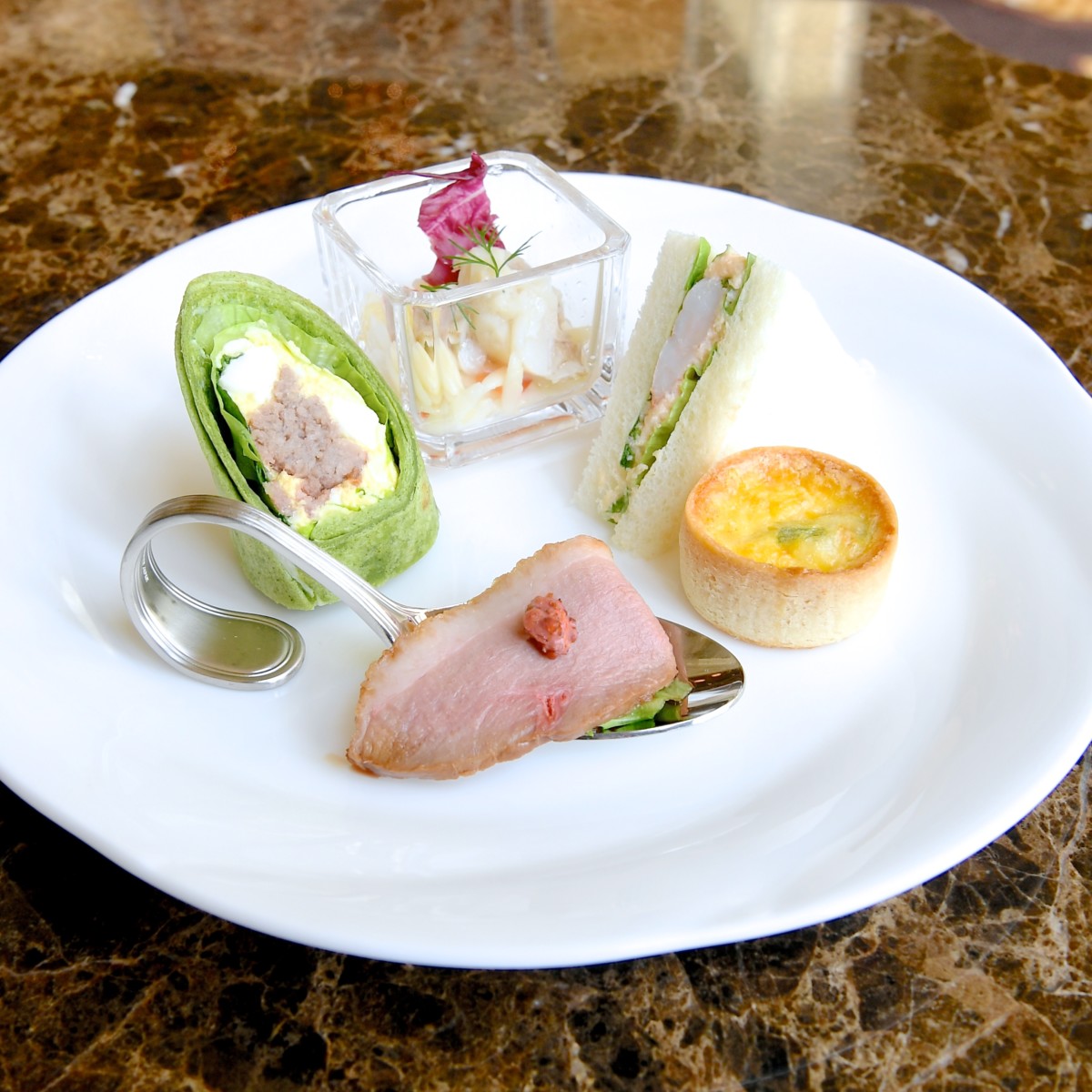 - サンドウィッチ&オードヴル ・カニと水菜のキッシュ ・エビとカリフラワーのサンドウィッチ ・帆立貝のマリネ 柚子風味 ・鴨のロースト カシスマスタードソース ・ミートローフとエッグサラダのグリーントルティーヤ ・マッシュルームのクリームスープ
