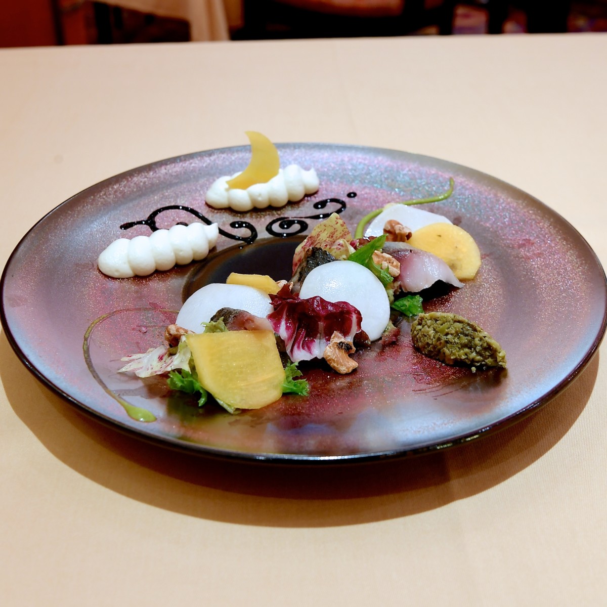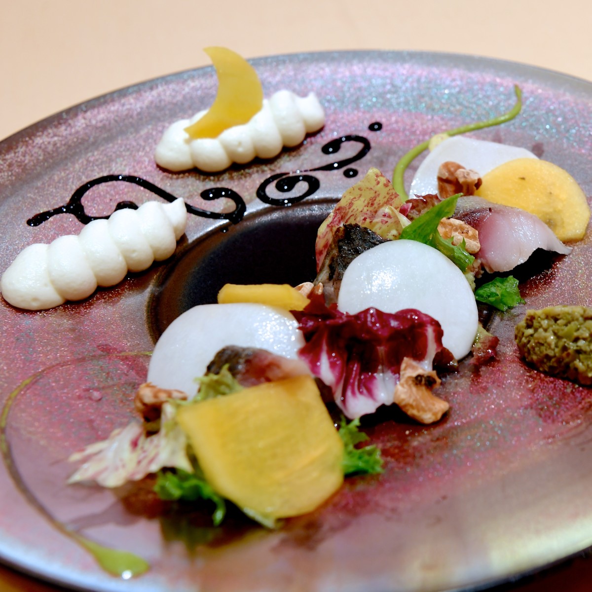 まろやかで濃厚な蕪のムースやバルサミコソース、グリーンタプナードソースなど様々な味わいとともに楽しめます☆
