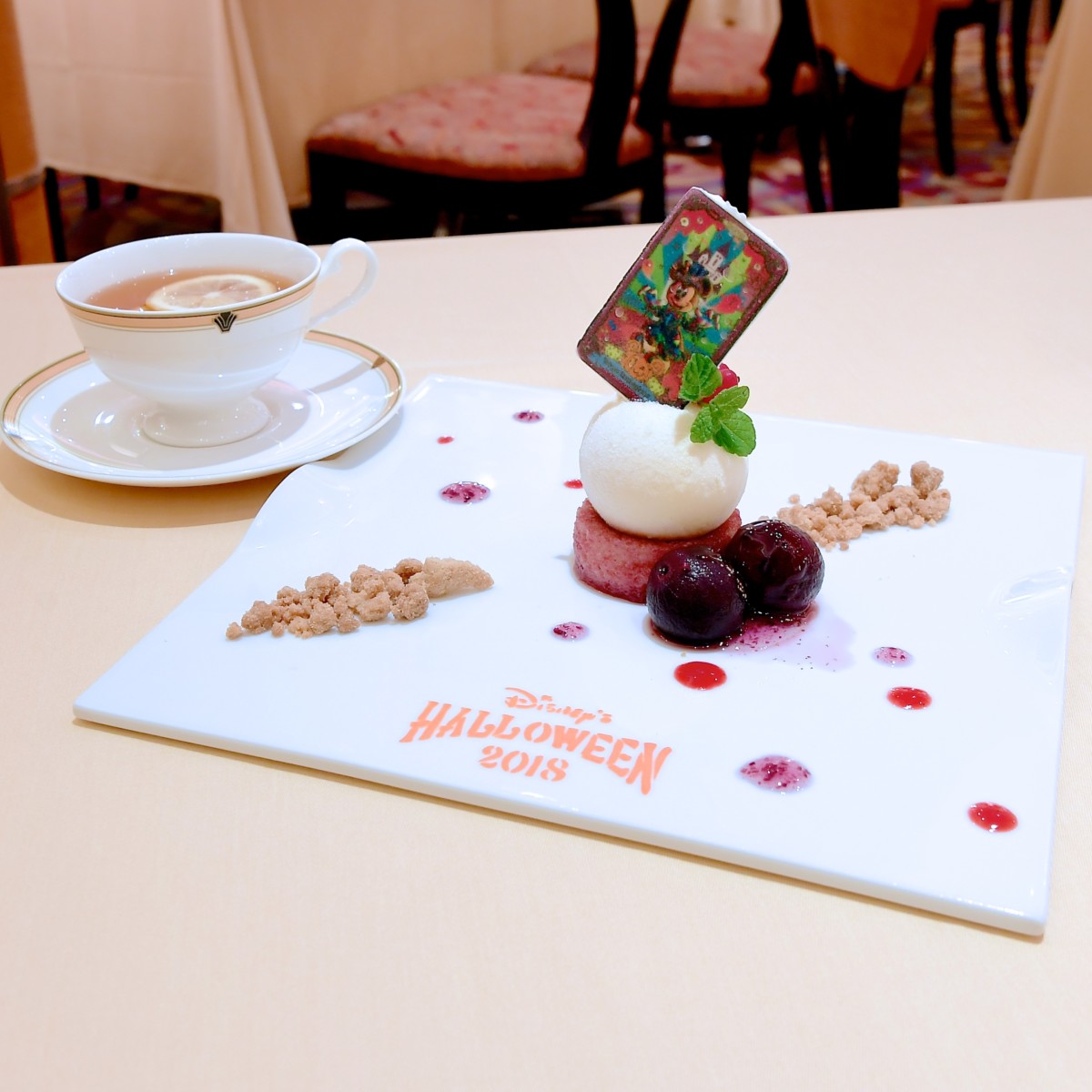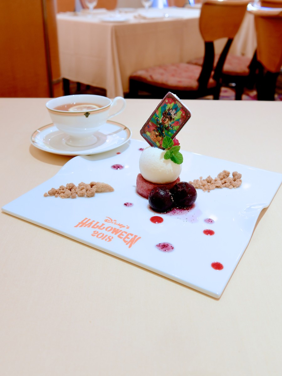 デザートには、東京ディズニーランドのディズニー・ハロウィーンのメインパレード「スプーキー“Boo!”パレード」のゴーストミッキーがデザインされたタロットカード型砂糖菓子がトッピングされています。