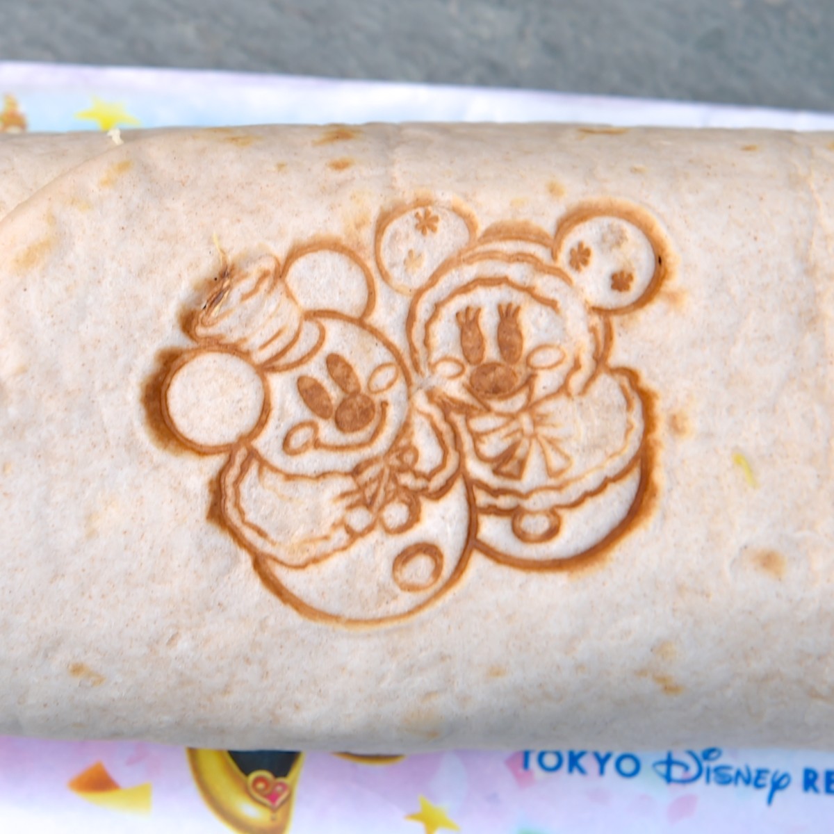 寄り添い合うミッキーとミニーのスノースノーが白いトルティーヤにデザインされています。