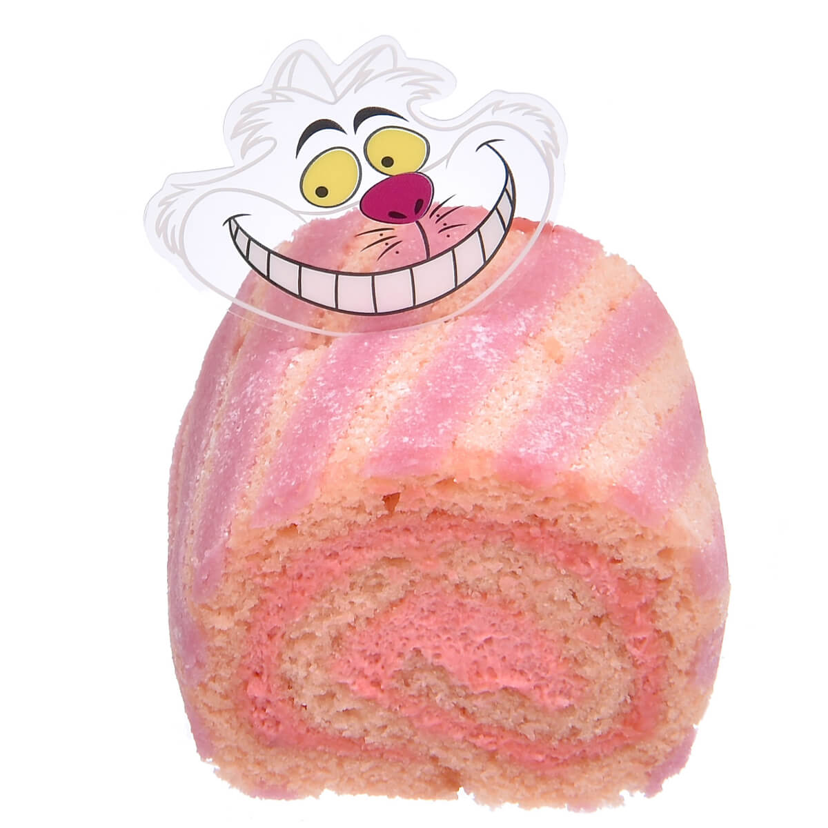 チェシャ猫のケーキはラズベリークリームとベリー風味スポンジのロールケーキ。