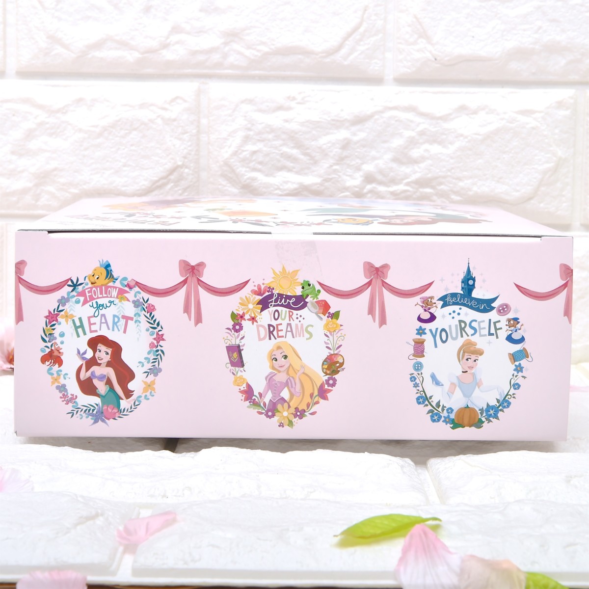 シンデレラ、アリエル、ラプンツェル、3人のプリンセスが描かれた、優しい色使いのボックス入り。