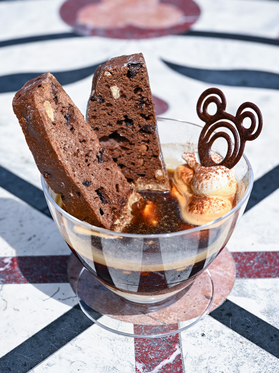 たっぷりなクリームチーズ、エスプレッソにチョコチップ&クルミのビスコッティ、ミッキーシェイプのチョコレートがトッピングされた大人なデザート☆