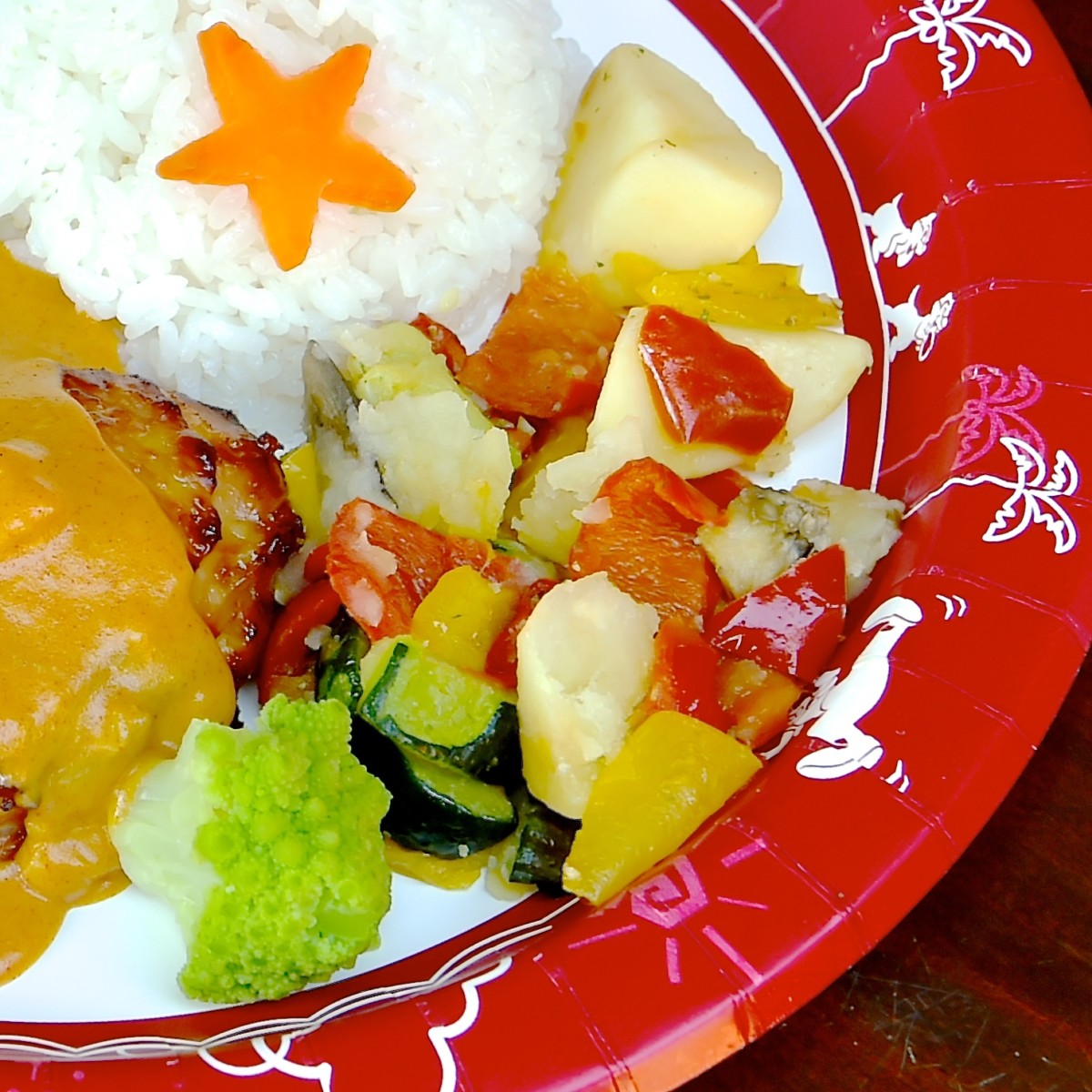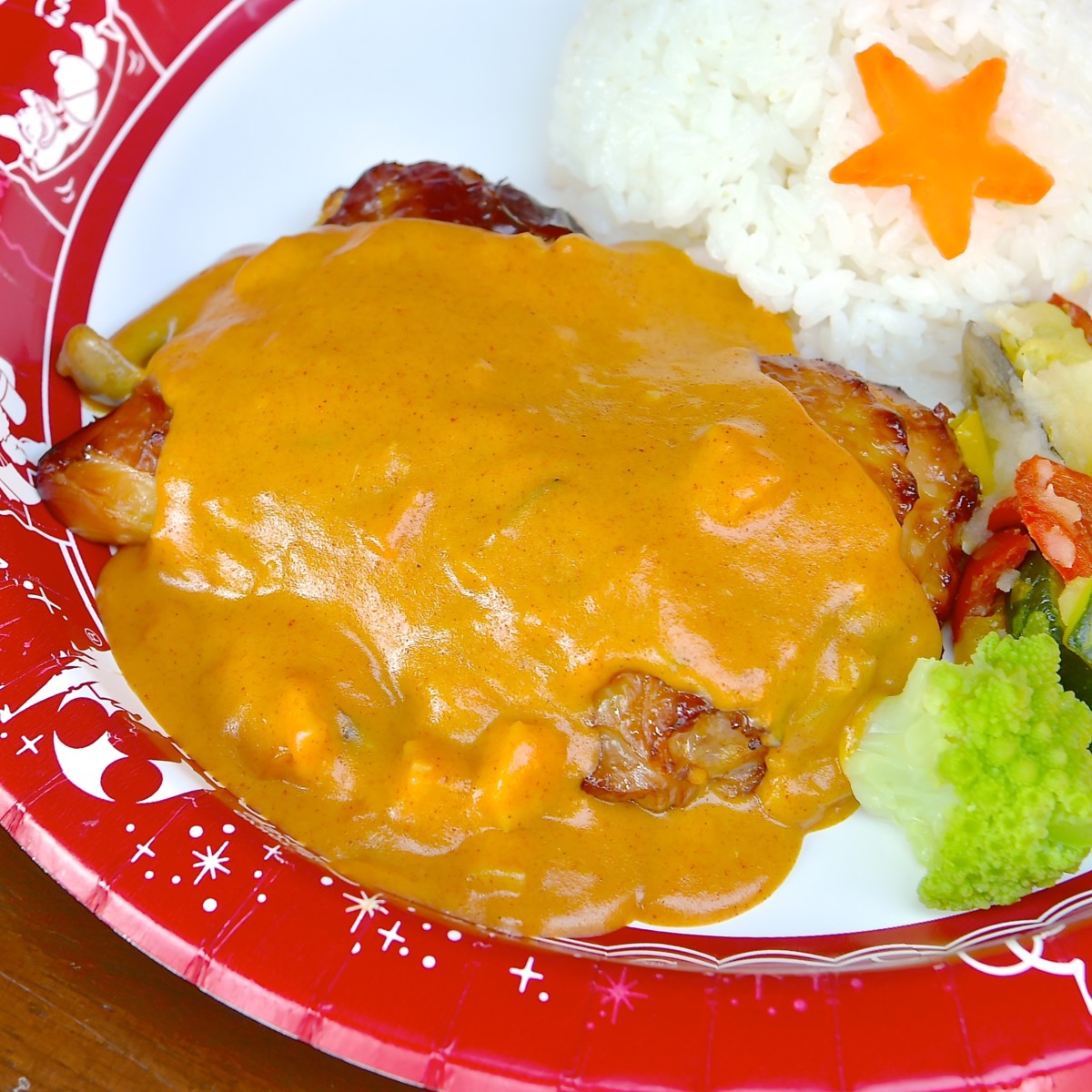 - ローストチキン、シーフードとキノコのクリームソース、ライスとベジタブル添え