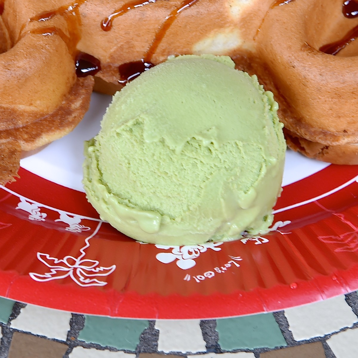 冬の季節のワッフルにバニラアイスクリームではなく、和風の抹茶アイスクリームが添えられています。