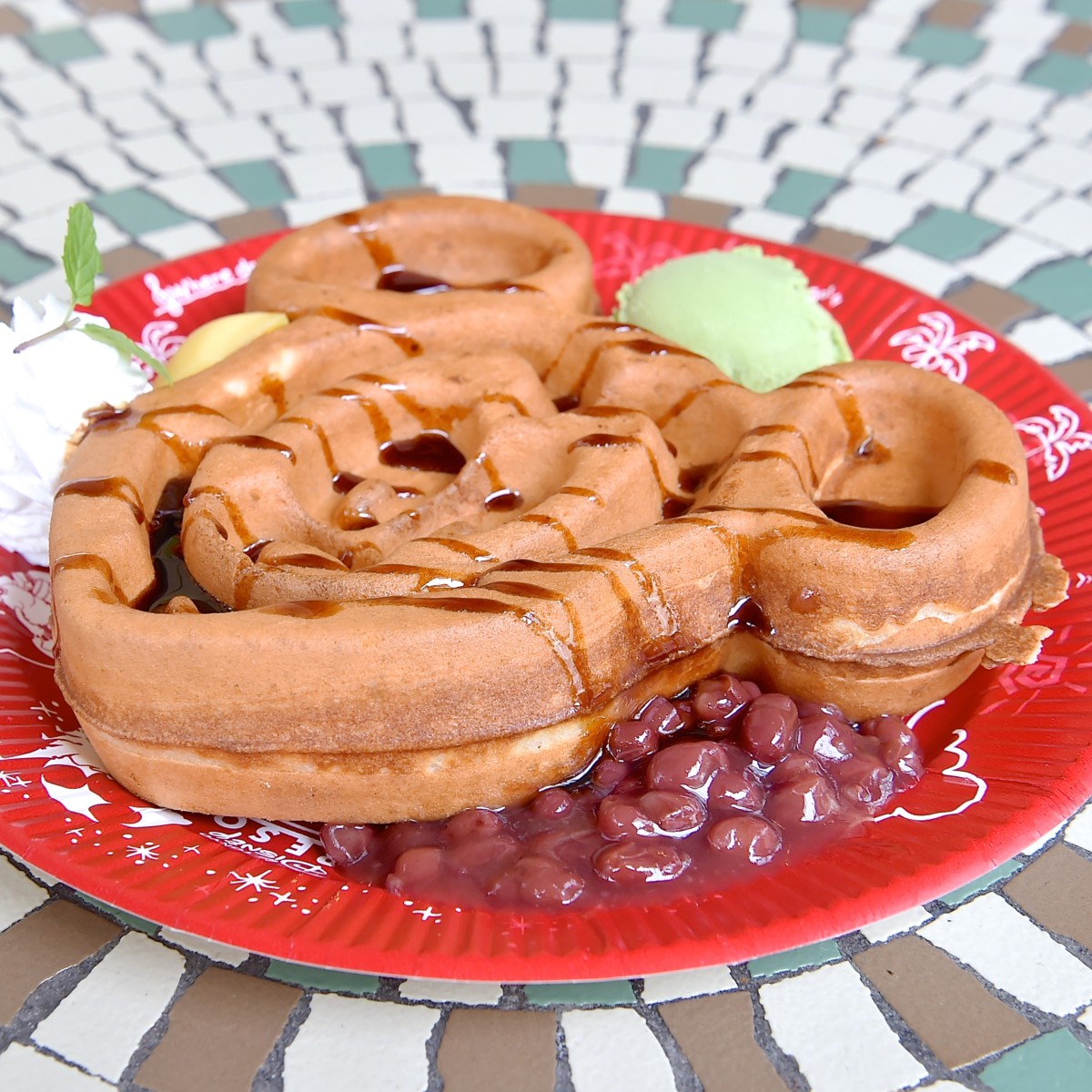 どれも美味しいメニューですが、和風な味付けが好きな方には冬の季節のワッフル「あずき&抹茶アイスクリーム」は特におすすめのパークフードです☆