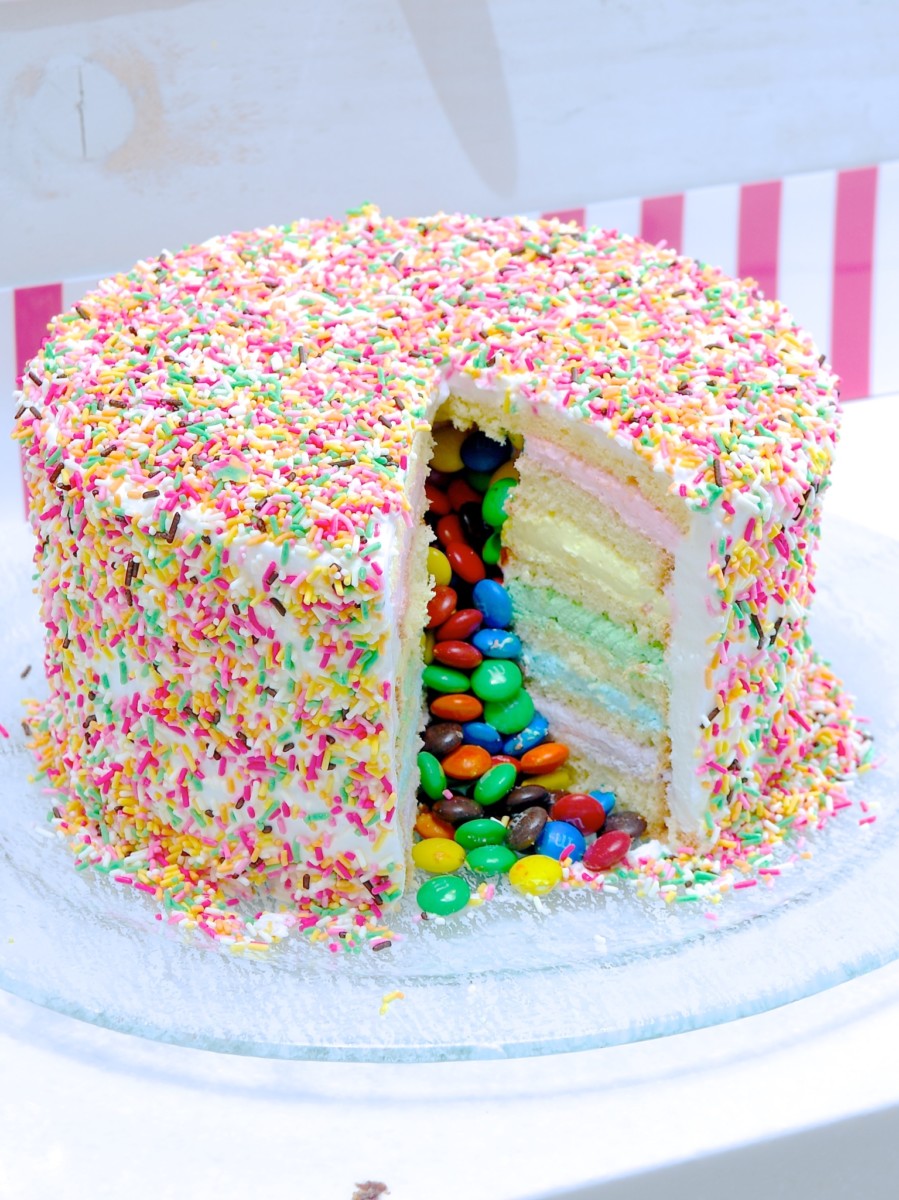 チョコスプレーがトッピングされたケーキをカットすると、m&m'sが溢れ出してきます☆