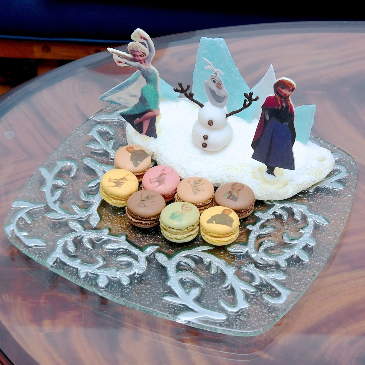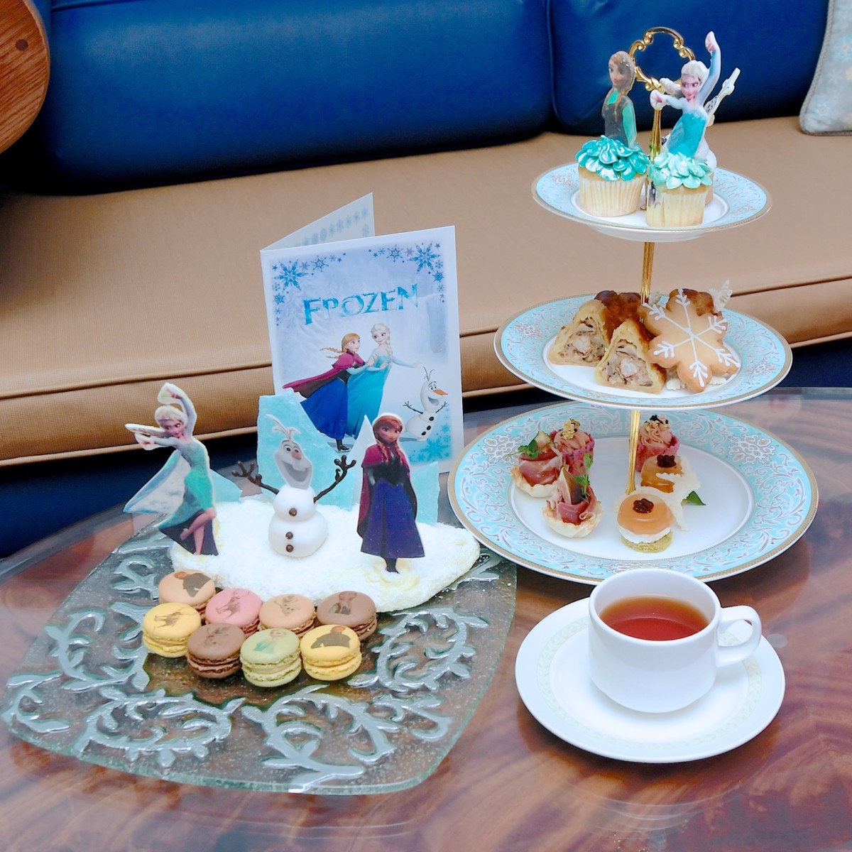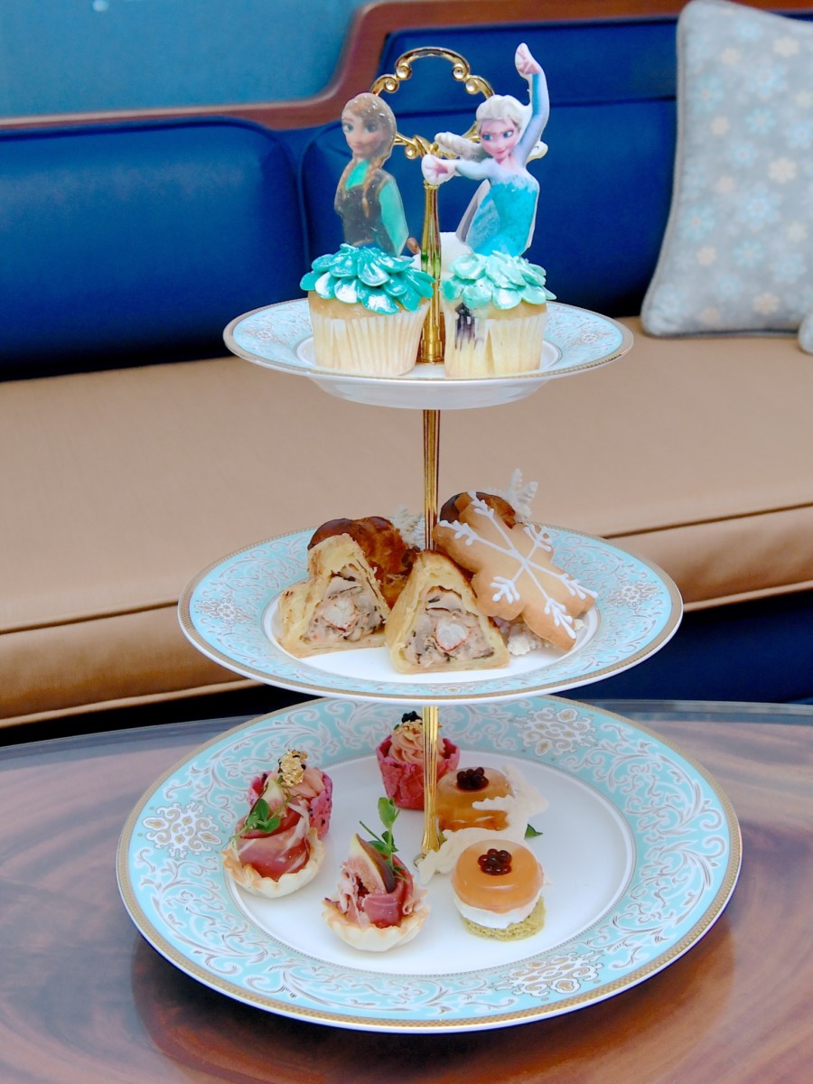 ティースタンドにはアナ、エルサ、オラフがデコレーションされたカップケーキや軽食。