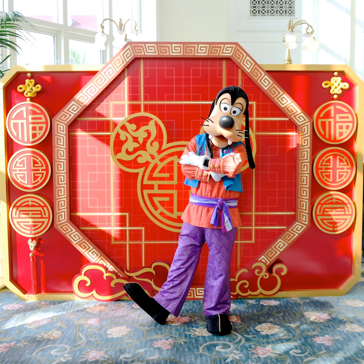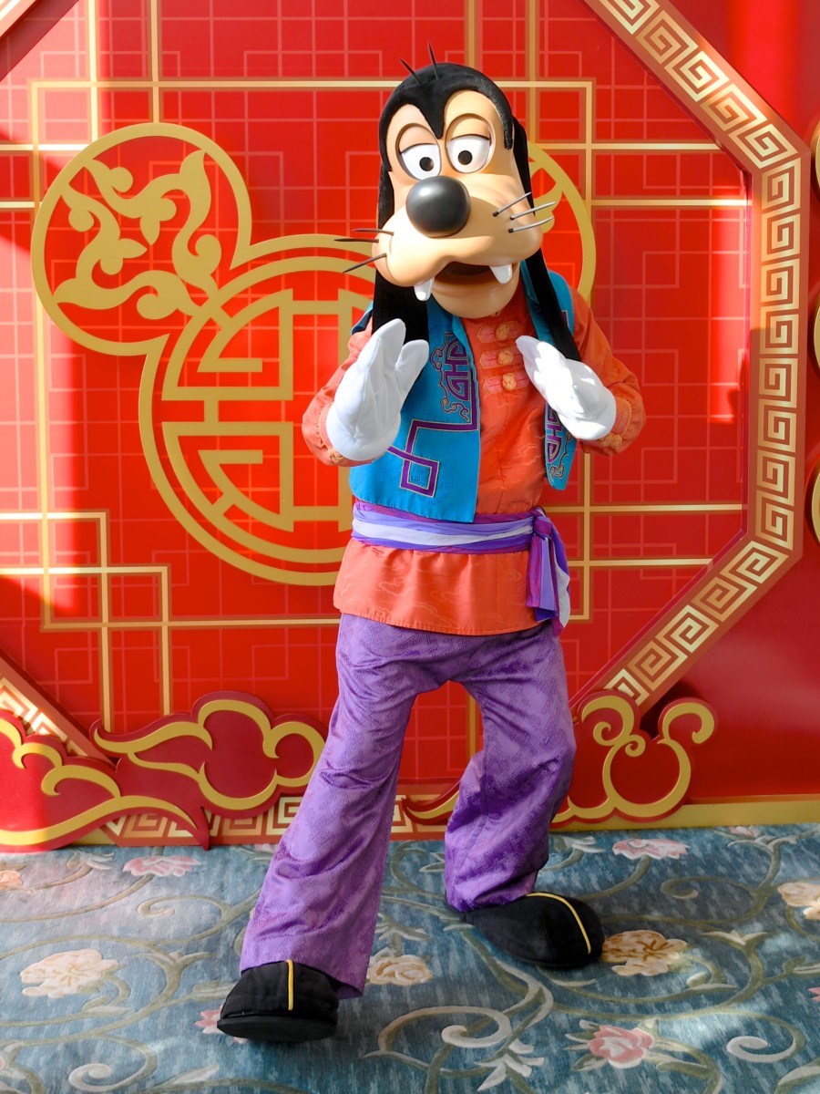 赤、青、紫の威厳ある太極拳マスターのコスチュームを着たグーフィーと一緒に太極拳ポーズで写真が撮れます☆