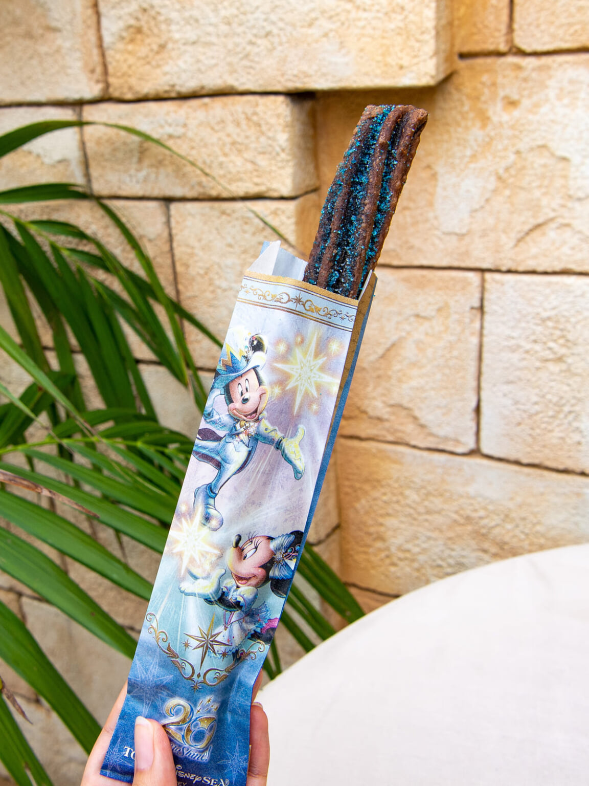 ビターチョコの生地の中にチョコクリームが入った東京ディズニーシー20周年のアニバーサリー期間限定チュロス。