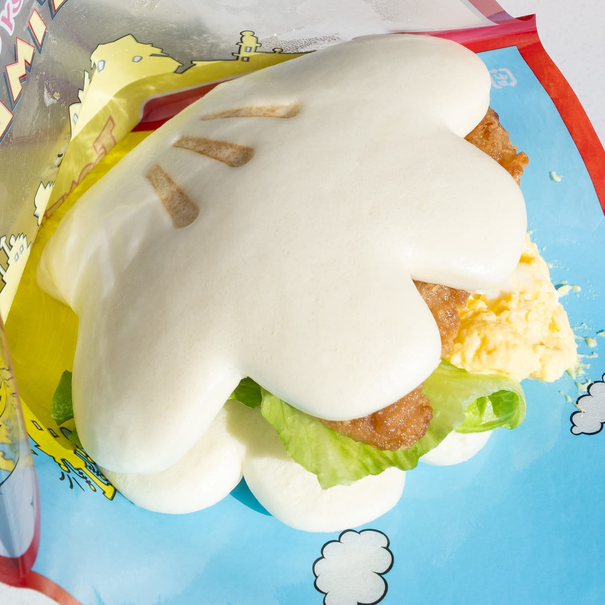 チキンと相性抜群なエッグサラダがたっぷりサンドされたグローブシェイプパオ。