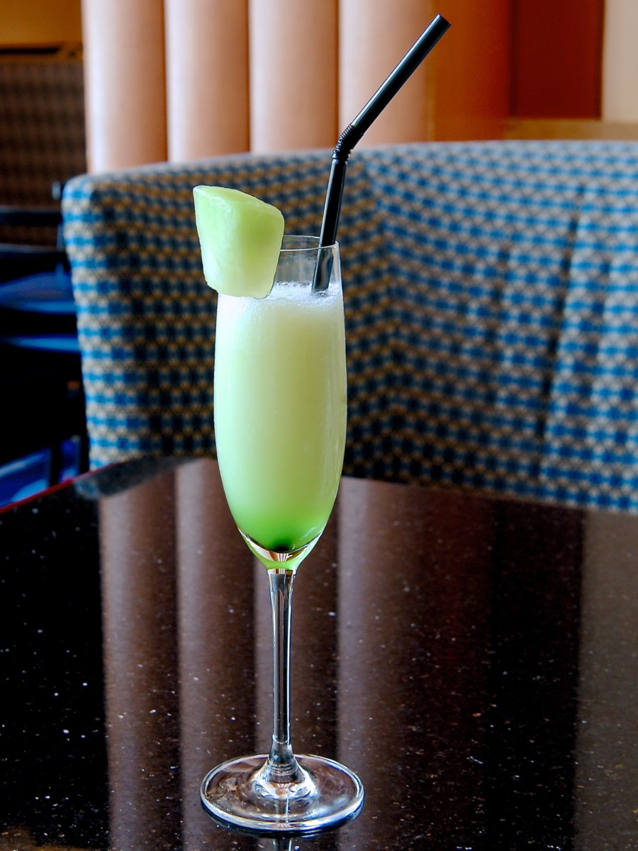 フレッシュフルーツ・カクテルは、フレッシュメロン、ジン、メロンリキュール、メロンシロップ、コーヒークリーム入り。