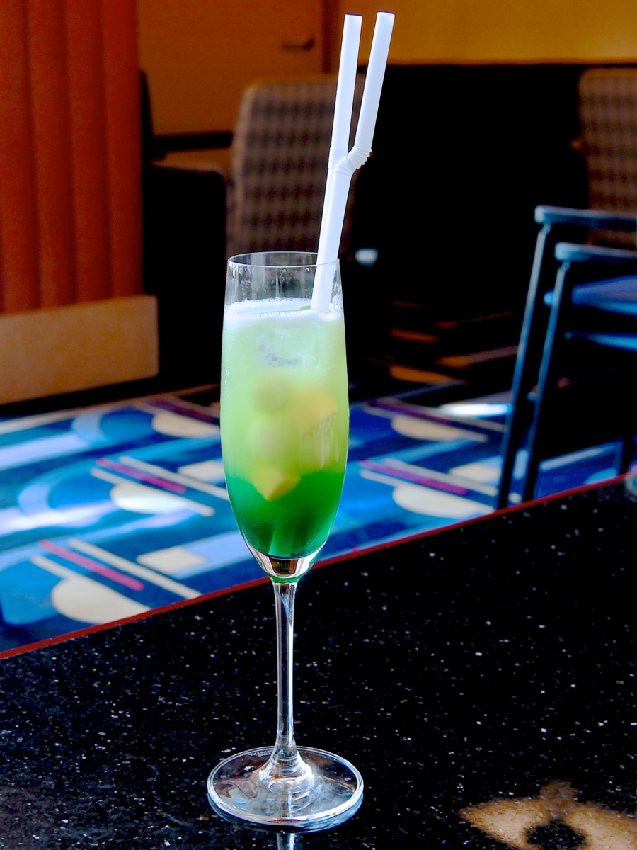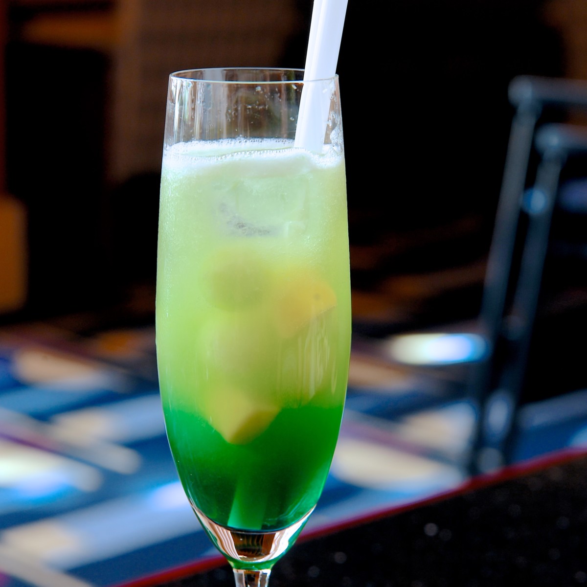 フレッシュフルーツ・ノンアルコールはカクテルレッシュメロン、メロンシロップ、ブルーシロップ、クラブソーダ、マンゴー、フレッシュミント入り。