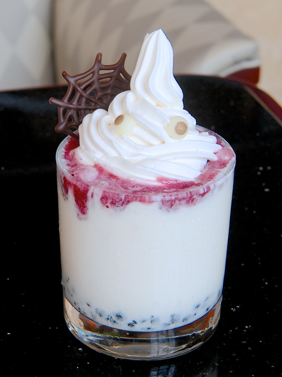 ウィスキー、アドヴォカート、ホイップクリーム、クリームチーズ、レモンジュース、ヨーグルト、砂糖、ココアクッキー、ブルーベリーソース、ストロベリーソース、ラズベリーピュレ、チョコレート入りの怖可愛いスウィーツドリンクカクテル。