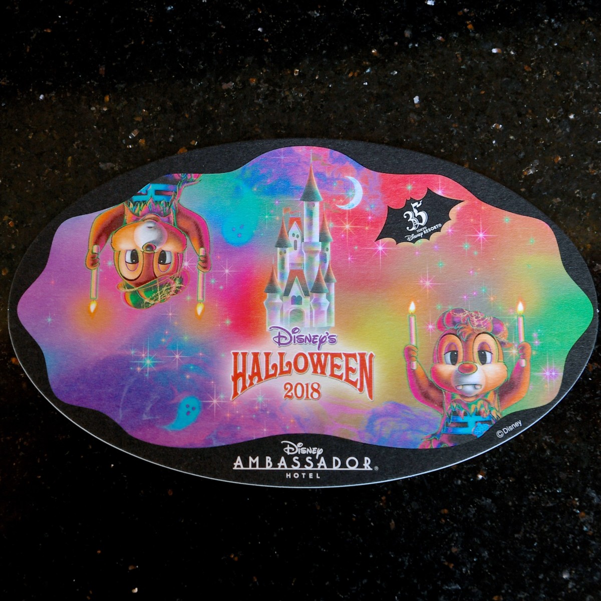 ろうそくを持ったチップ&デール、ゴーストたち、東京ディズニーリゾート35周年、ディズニー・ハロウィーン2018のロゴがデザインされたオリジナルコースター付きです。