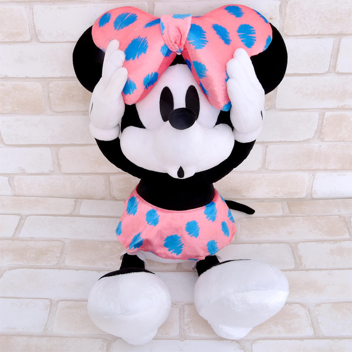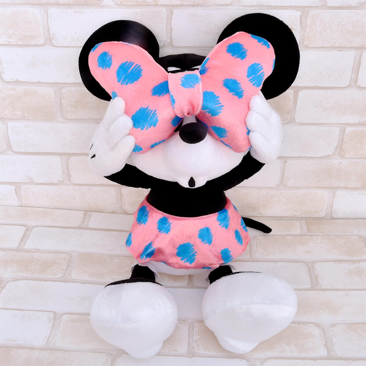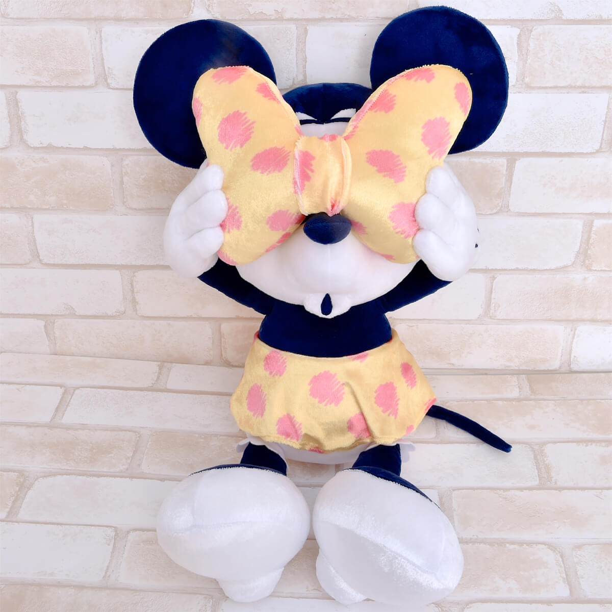 大きなリボンで目元を隠したミニーちゃんのぬいぐるみ。