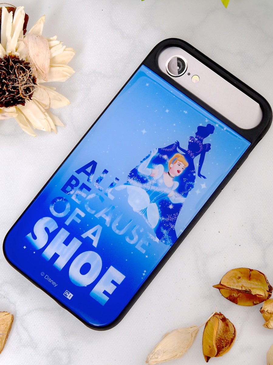 光沢感があるブルーのパネルにはシンデレラのシルエットと“ALL BECAUSE OF SHOE"の文字。