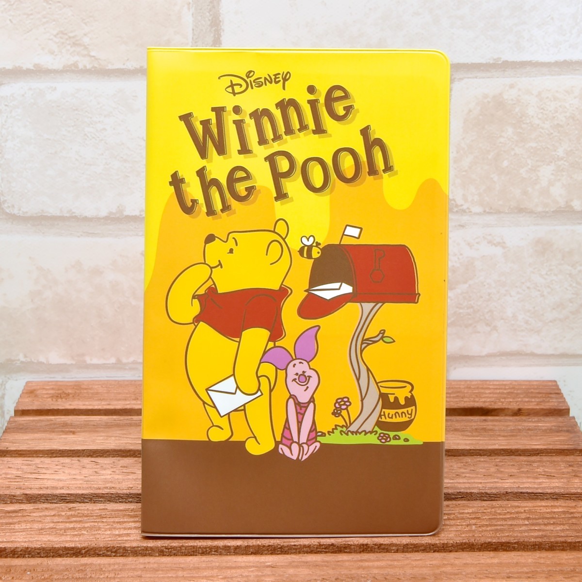 縦型ははちみつ柄を背景に、「くまのプーさん」と「ピグレット」がお手紙を待っているイラスト。