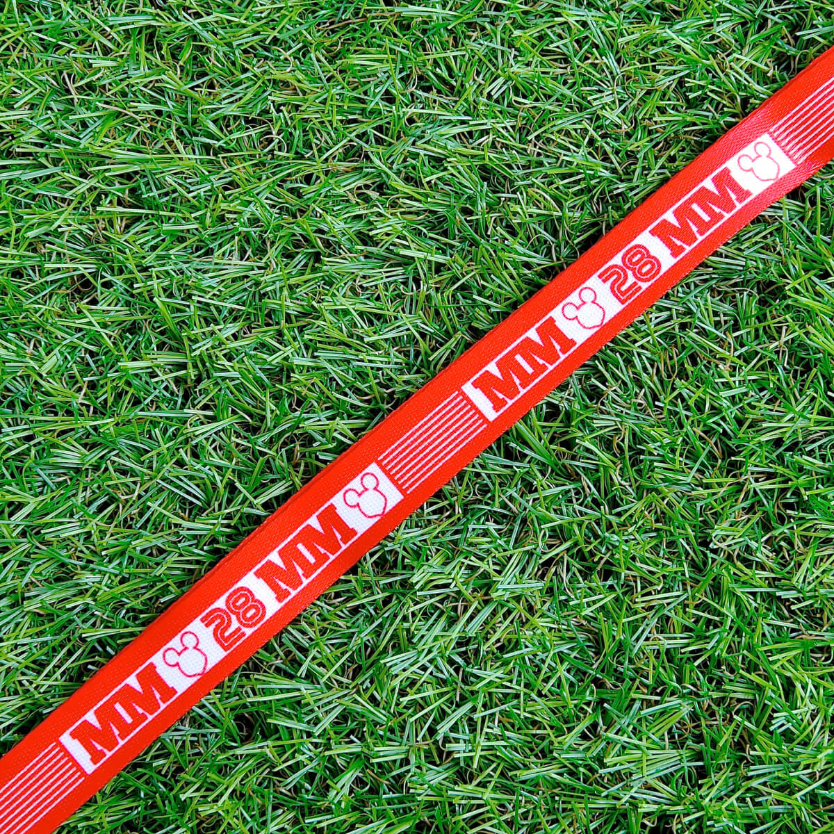 鮮やかな赤いストラップにはMM28の文字とミッキーマークがデザインされています。