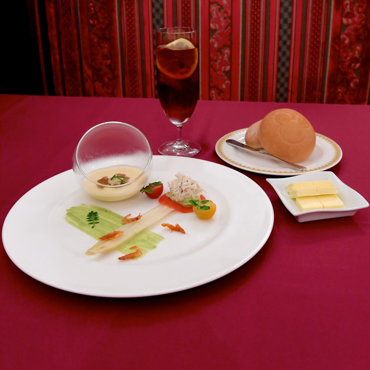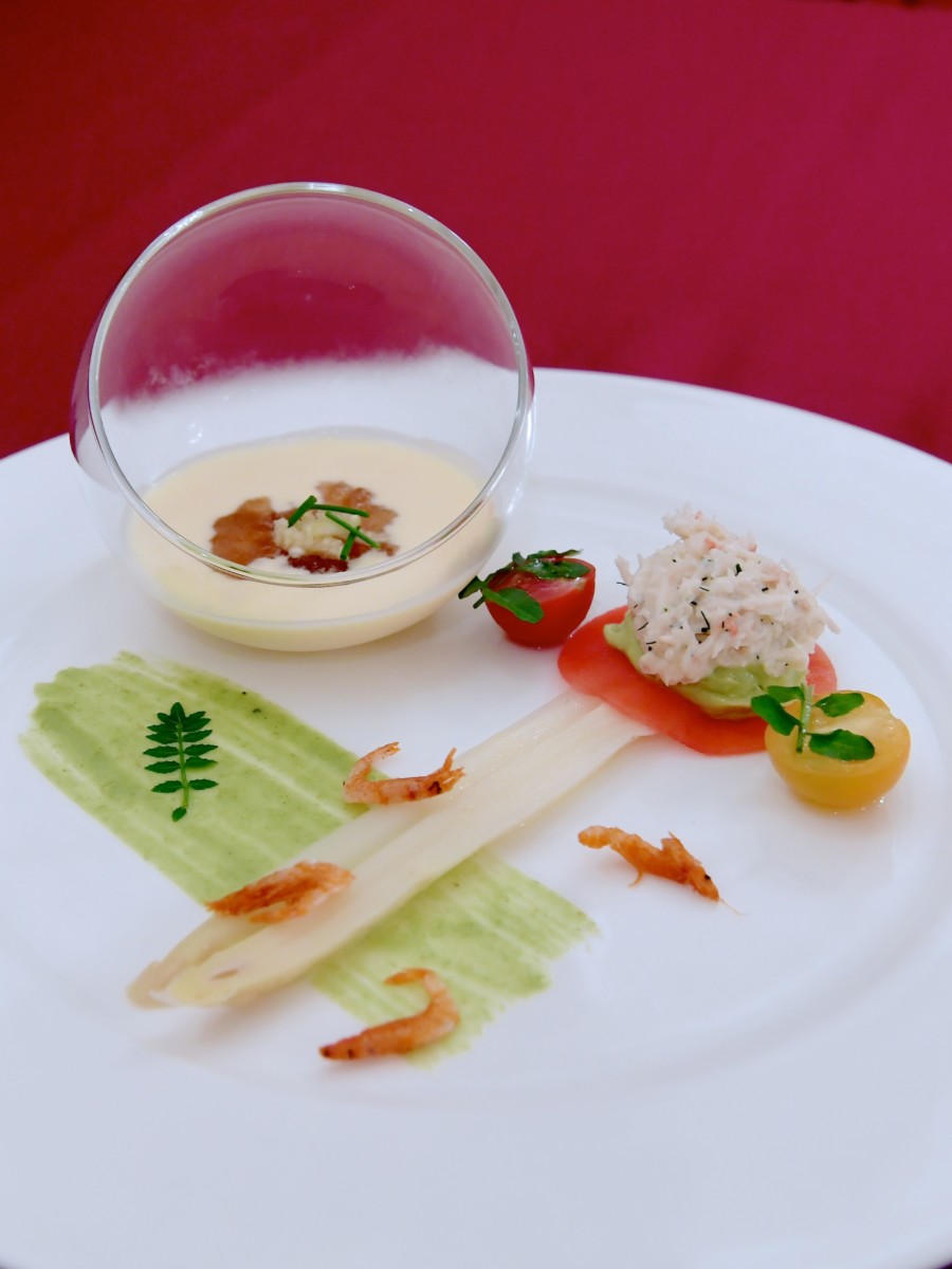 ホワイトアスパラガスのマリネとズワイ蟹のサラダ、冷製コーンクリームスープ