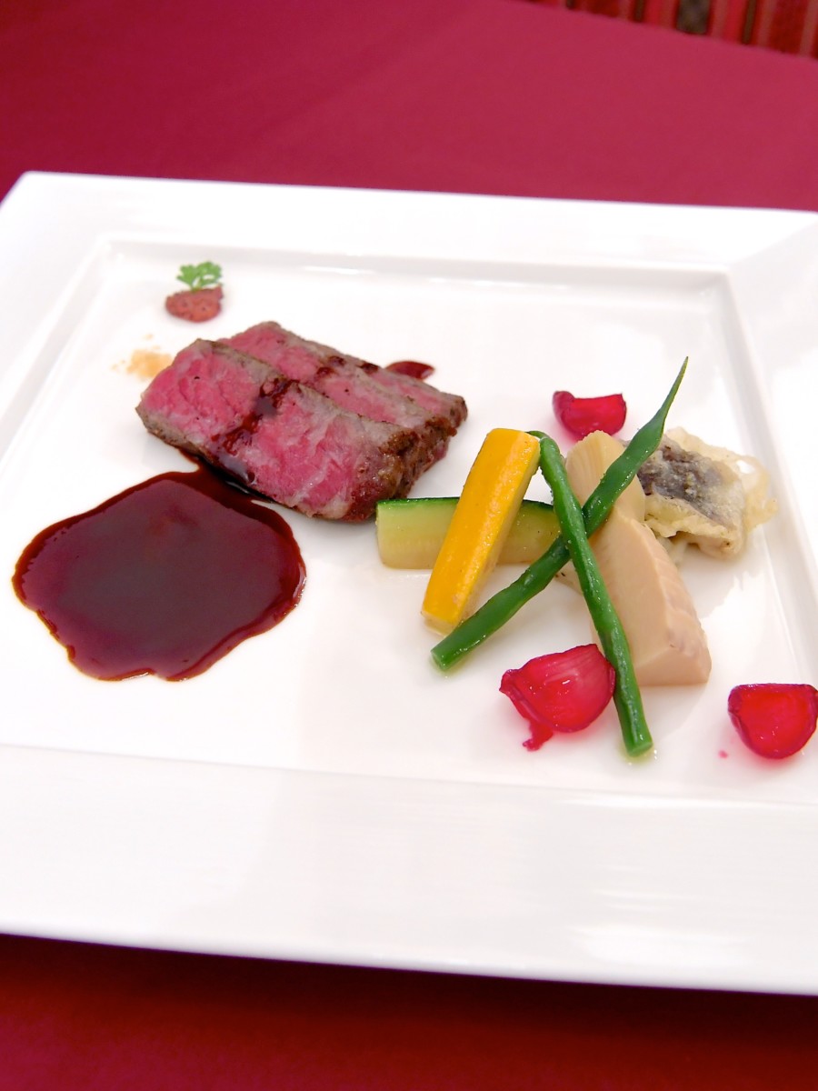 - 黒毛和牛のロースト、ヴァンルージュソースとカシスマスタード
