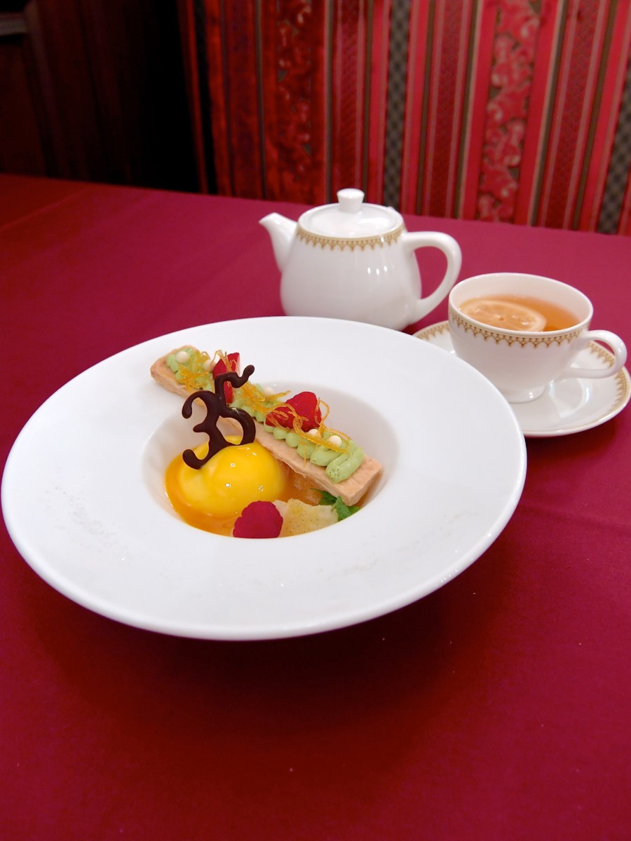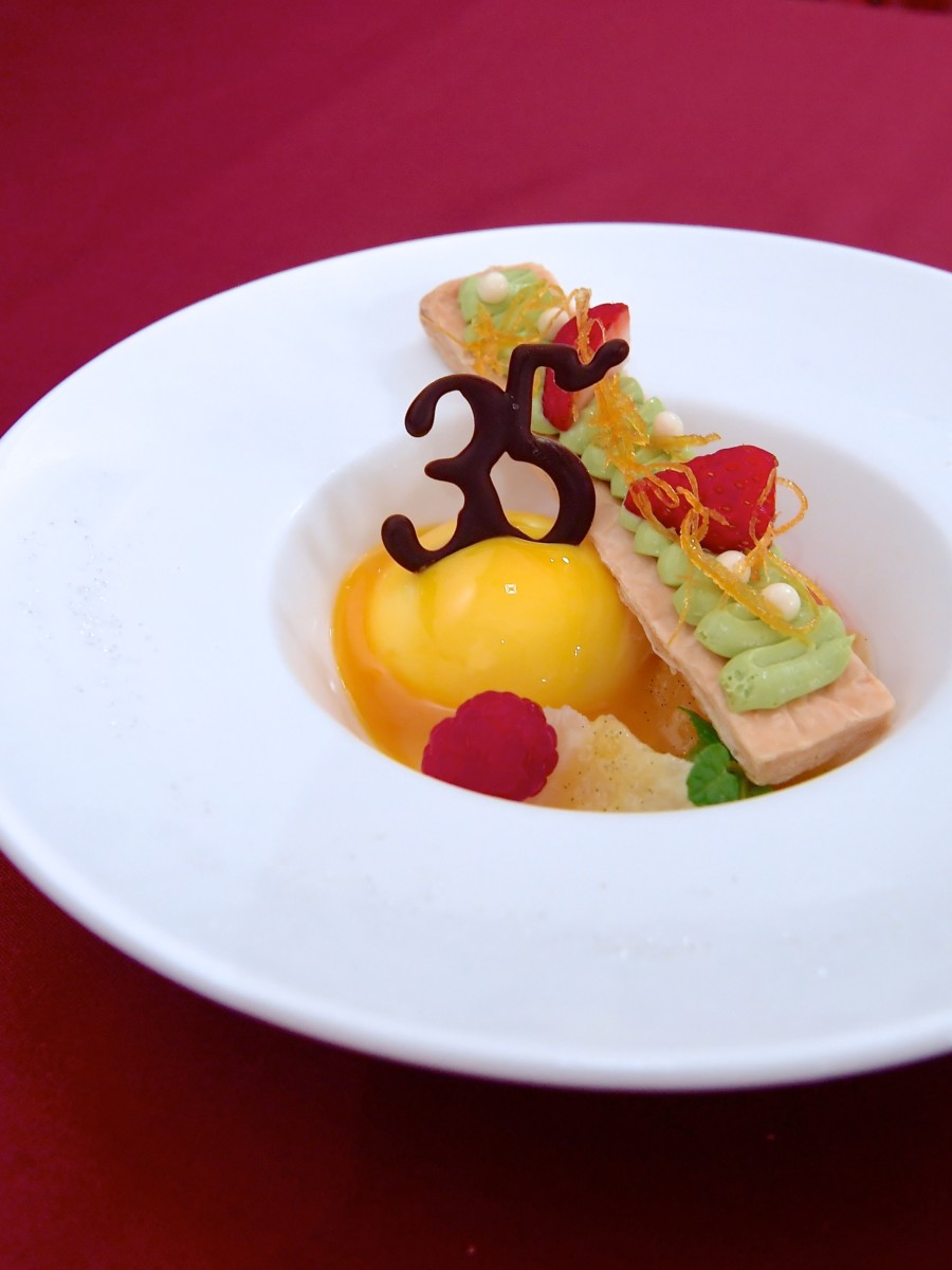 デザートは“東京ディズニーリゾート35周年Happiest Celebration!”の35のロゴチョコレートがトッピングされたフロマージュブランのムース。