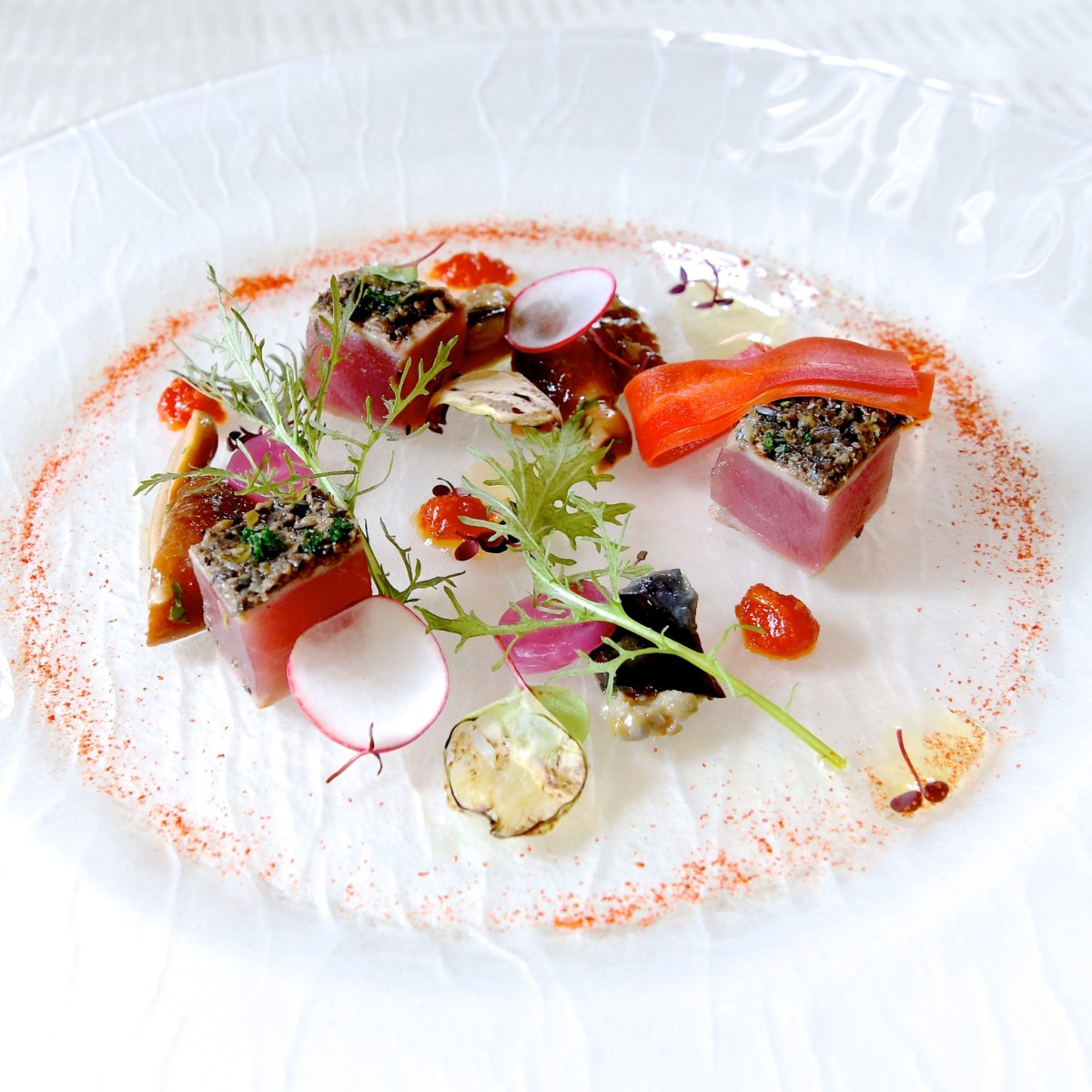 ブラックオリーヴを纏ったマグロのレアグリル  トマトのチャツネと共に
