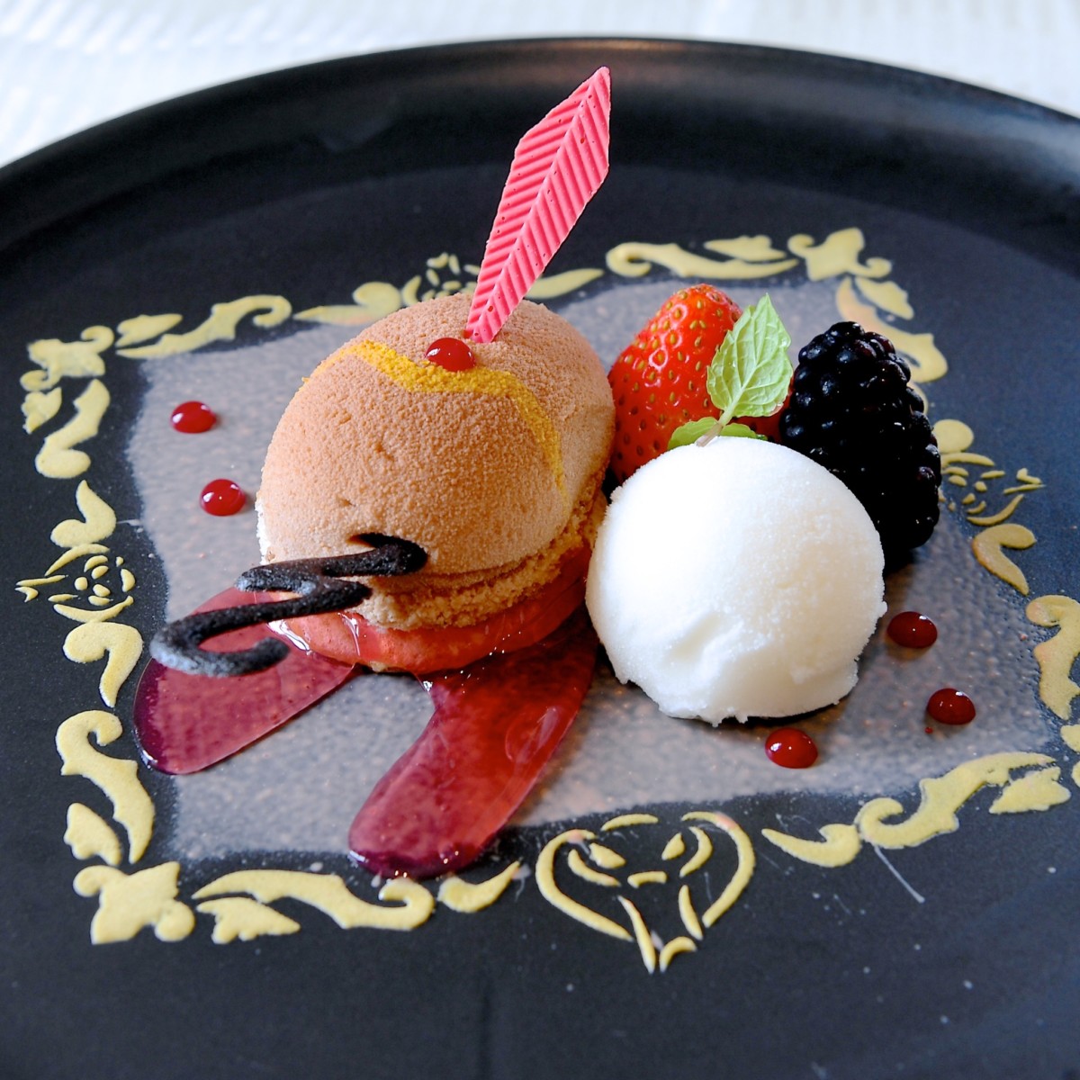 さっぱりいただけるりんごのソルベと木苺のソース、ベリーが添えられています。