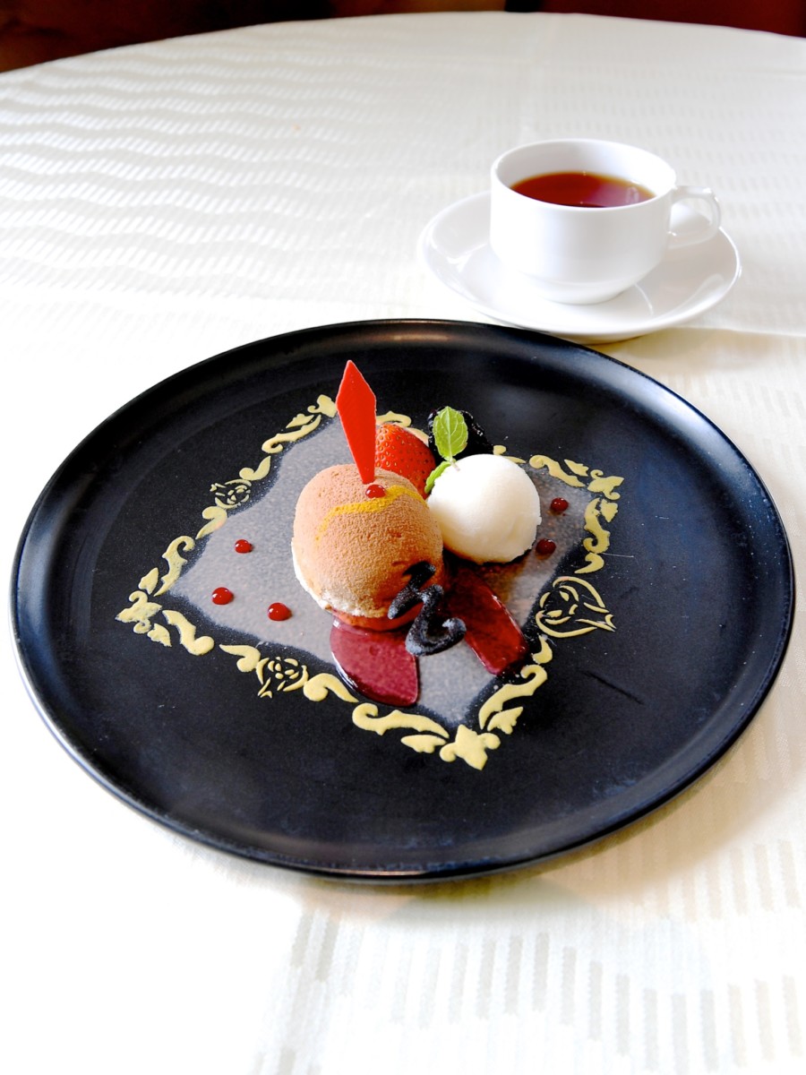 栗のケーキとリンゴのソルベ コーヒーまたは紅茶