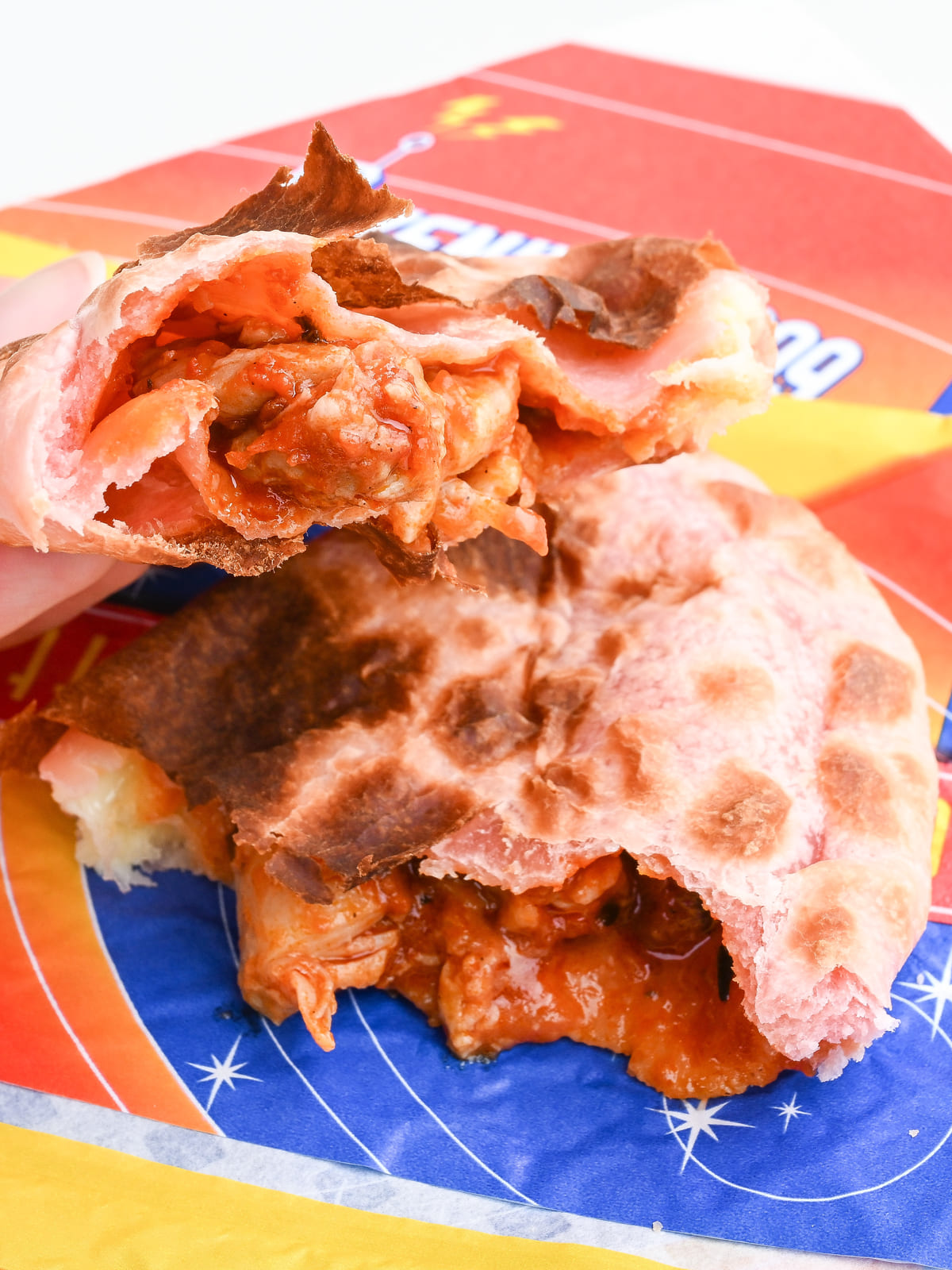 赤い生地に濃厚なトマトソースとチキンがつまったカルツォーネです。