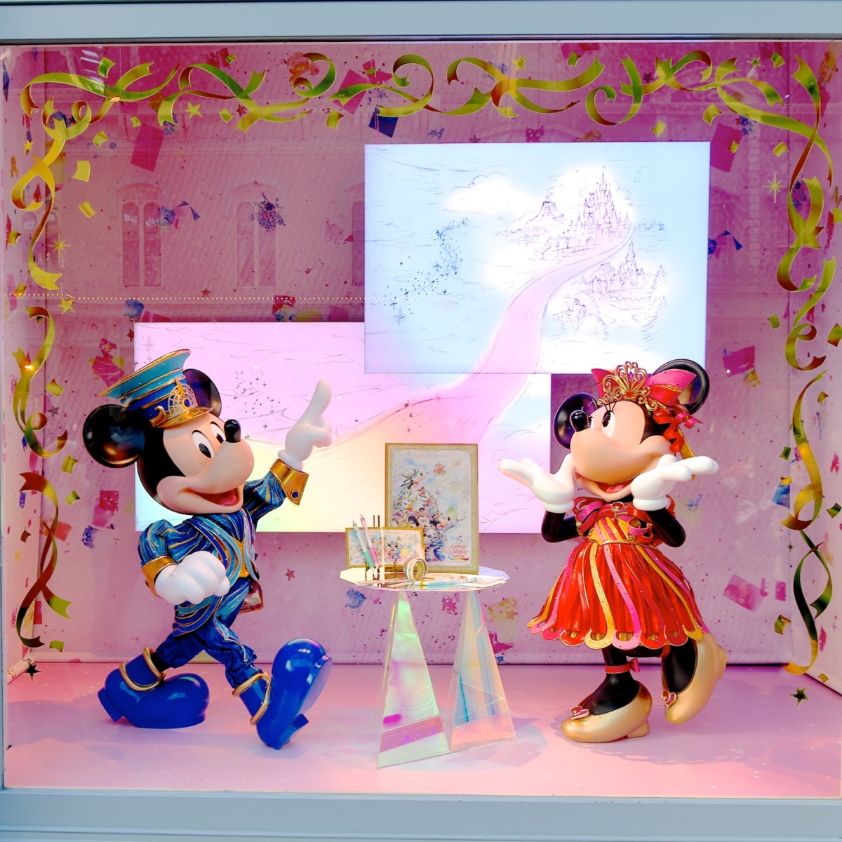 同じくワールドバザール内にあるパーク内最大のショップ、グランドエンポーリアムのウィンドウには、未来へ向かって歩いていくミッキー&ミニーのデコレーションや、