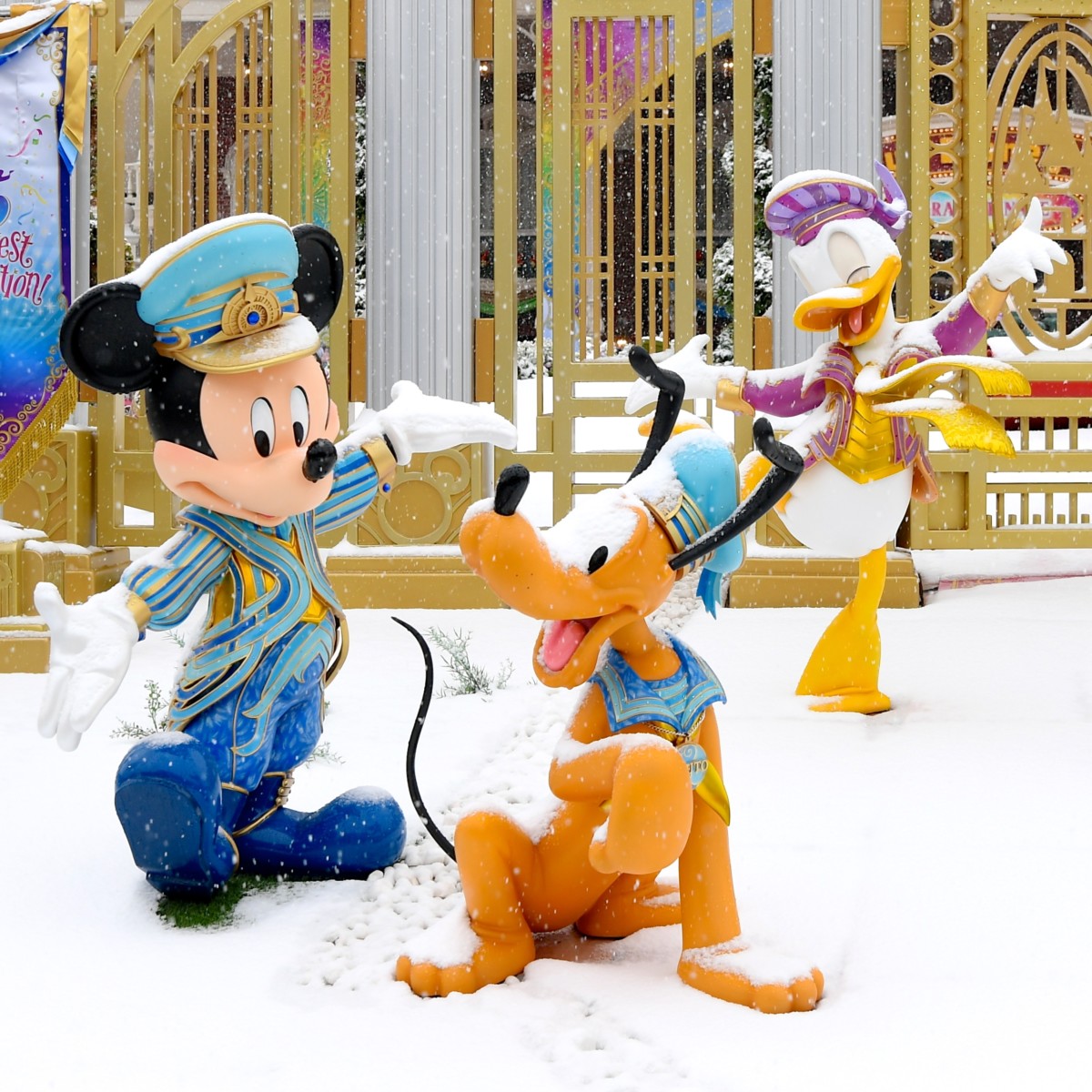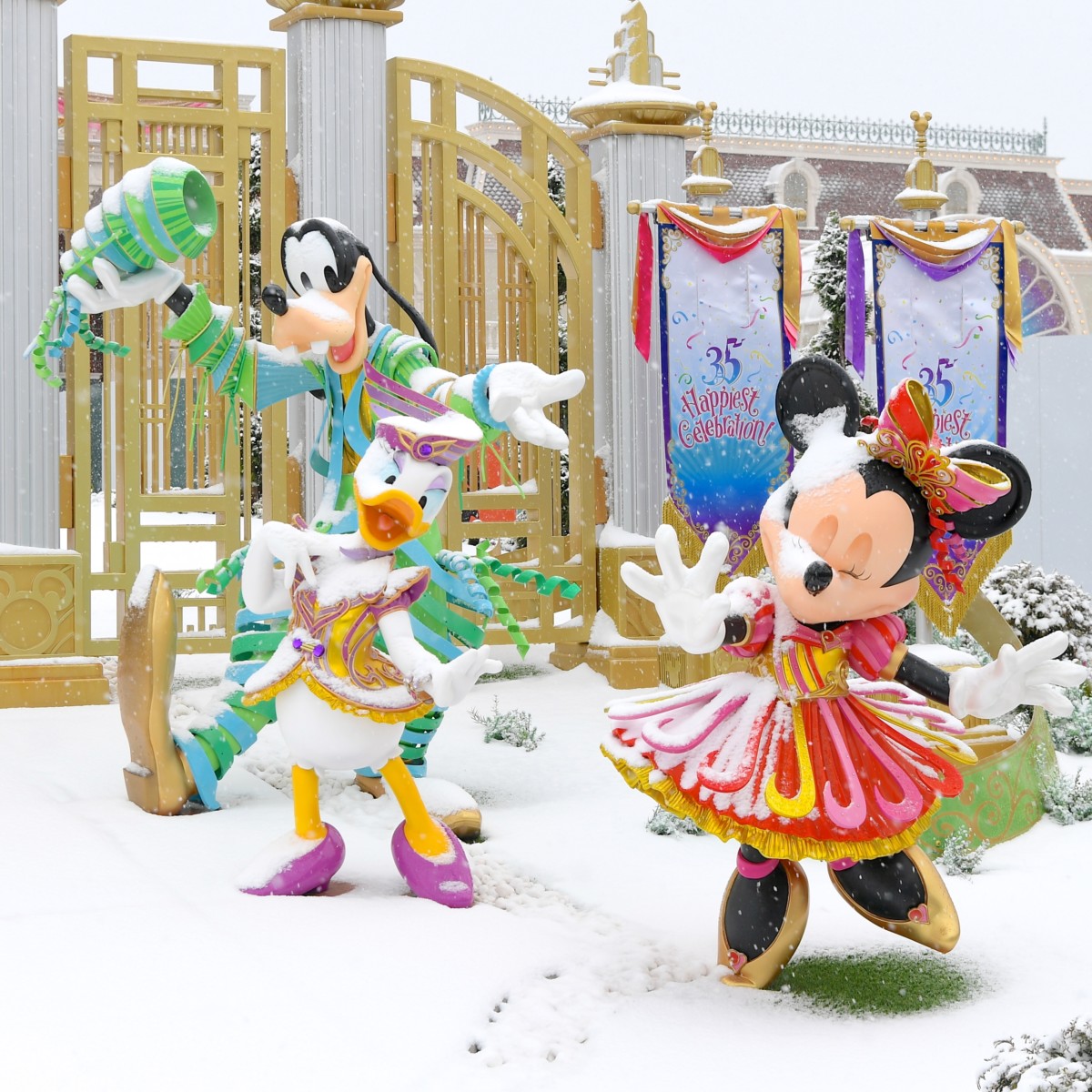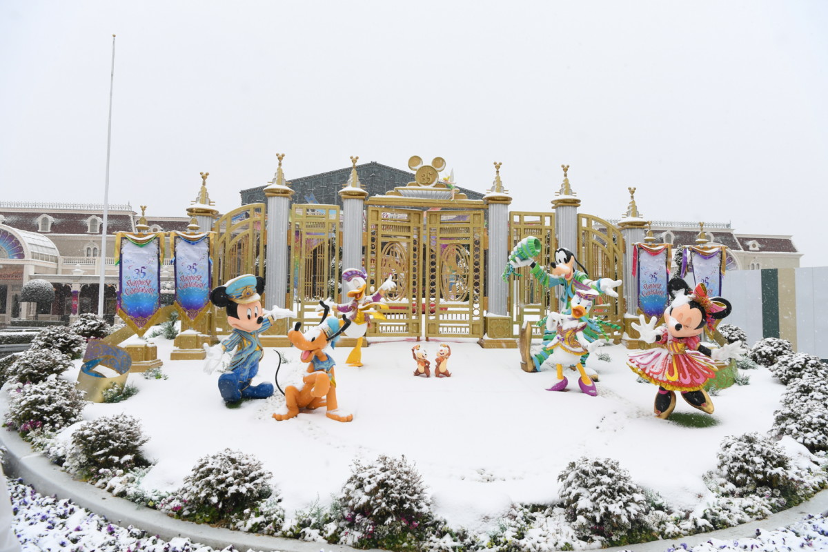 東京ディズニーリゾート35周年“Happiest Celebration!”のミッキー&フレンズモニュメントも雪化粧に。