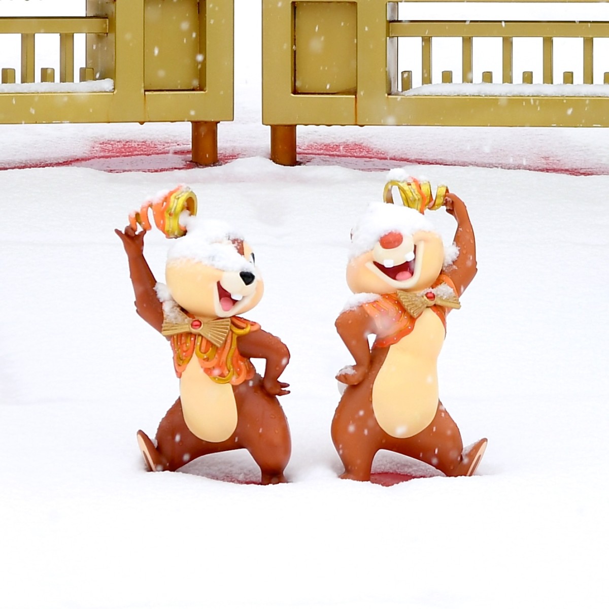 ミッキーたちのブロンズにもかわいい雪化粧が!