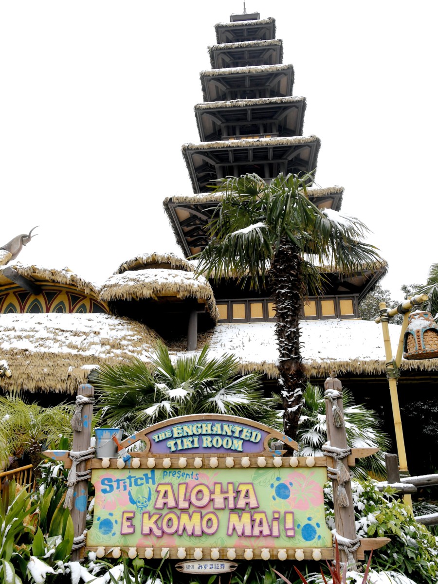 建物全体が雪化粧に覆われている「魅惑のチキルーム:スティッチ・プレゼンツ “アロハ・エ・コモ・マイ!”」