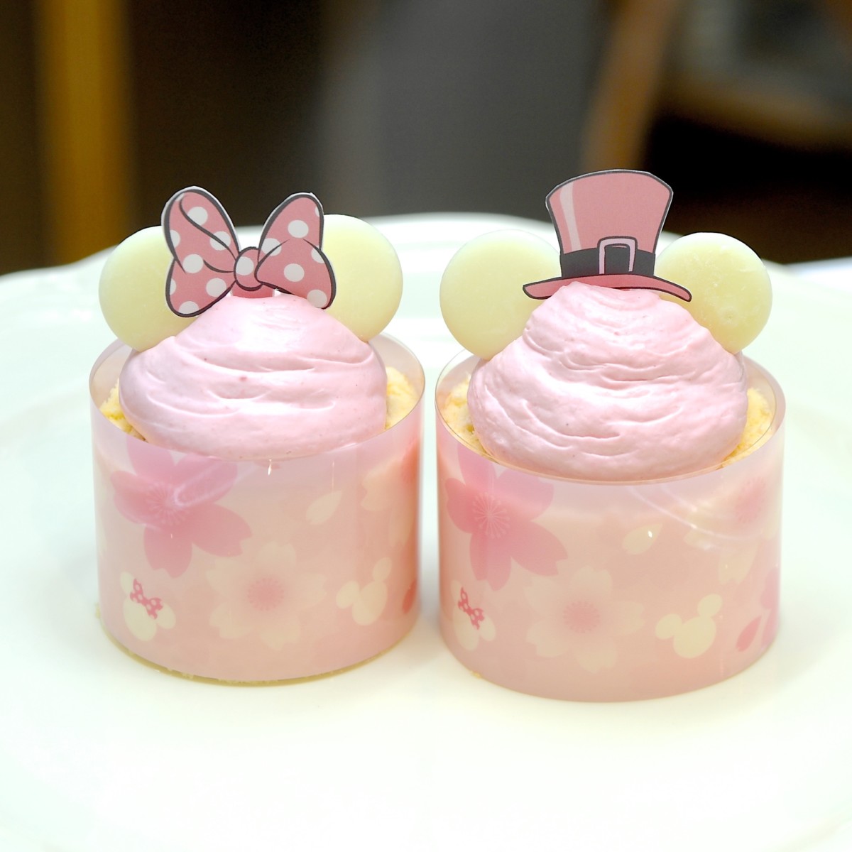ミッキー、ミニーがデザインされた桜模様のフィルムを巻いて、「ミッキーマウス」と「ミニーマウス」のケーキができあがり☆