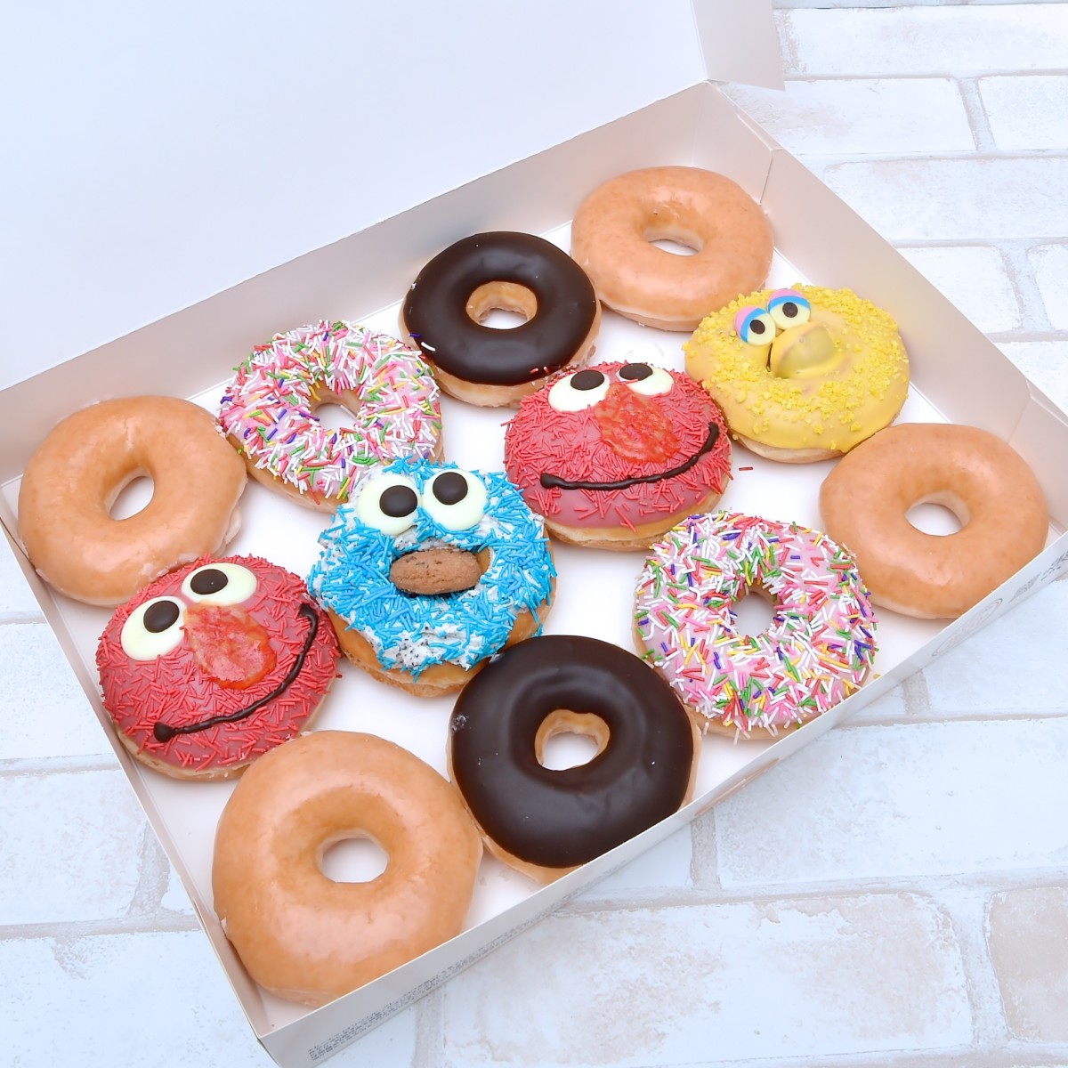「セサミストリート」のキャラクターを再現したドーナツ3種と、人気のオリジナル・グレーズドなど12個が入ったお得なボックスセット。