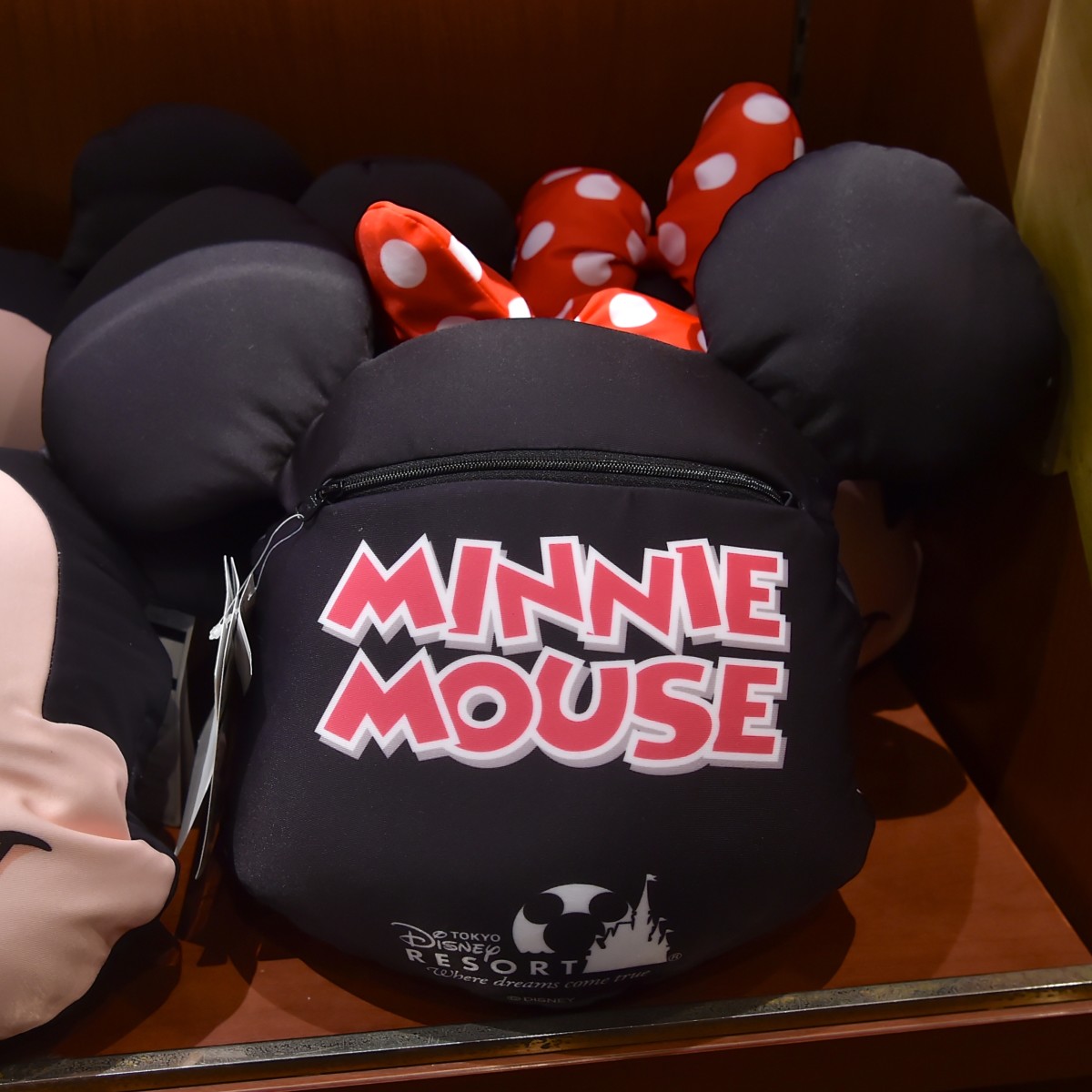 赤のドット柄リボンをしたミニーマウスのお顔型クッションも同時発売。