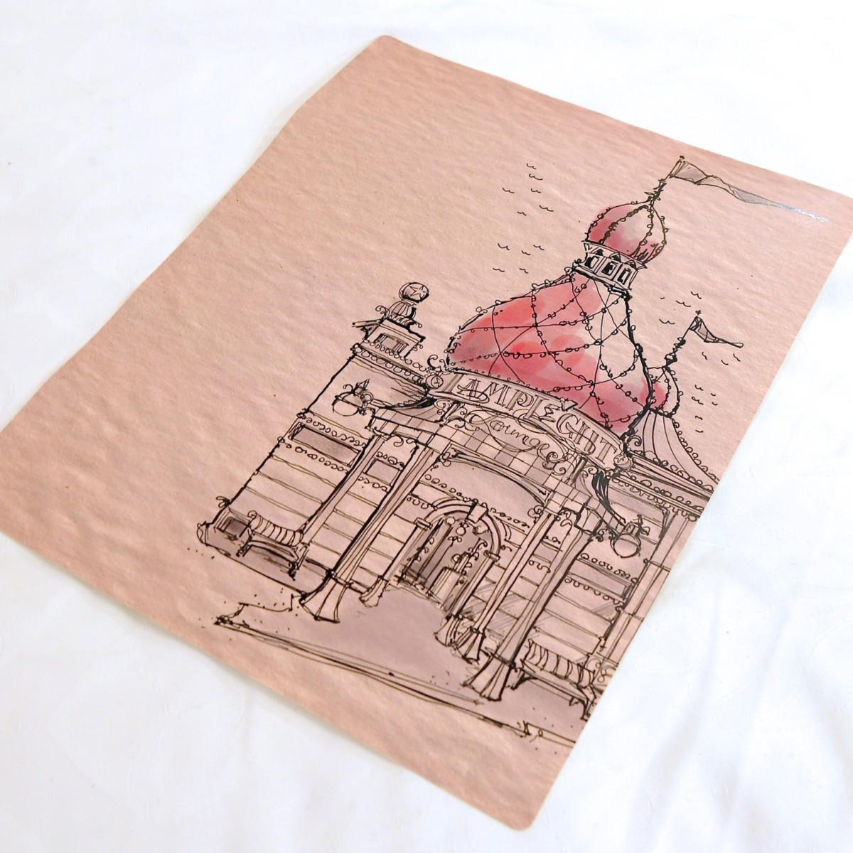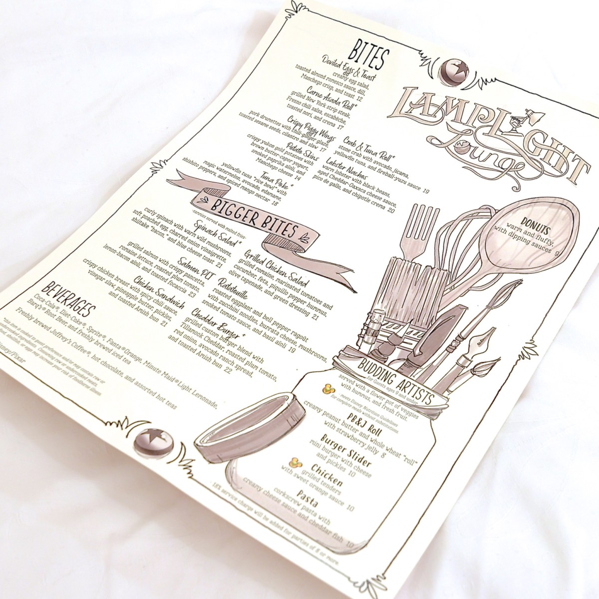 ランプライト・ラウンジのメニュー表には、レストランの外観が描かれ、