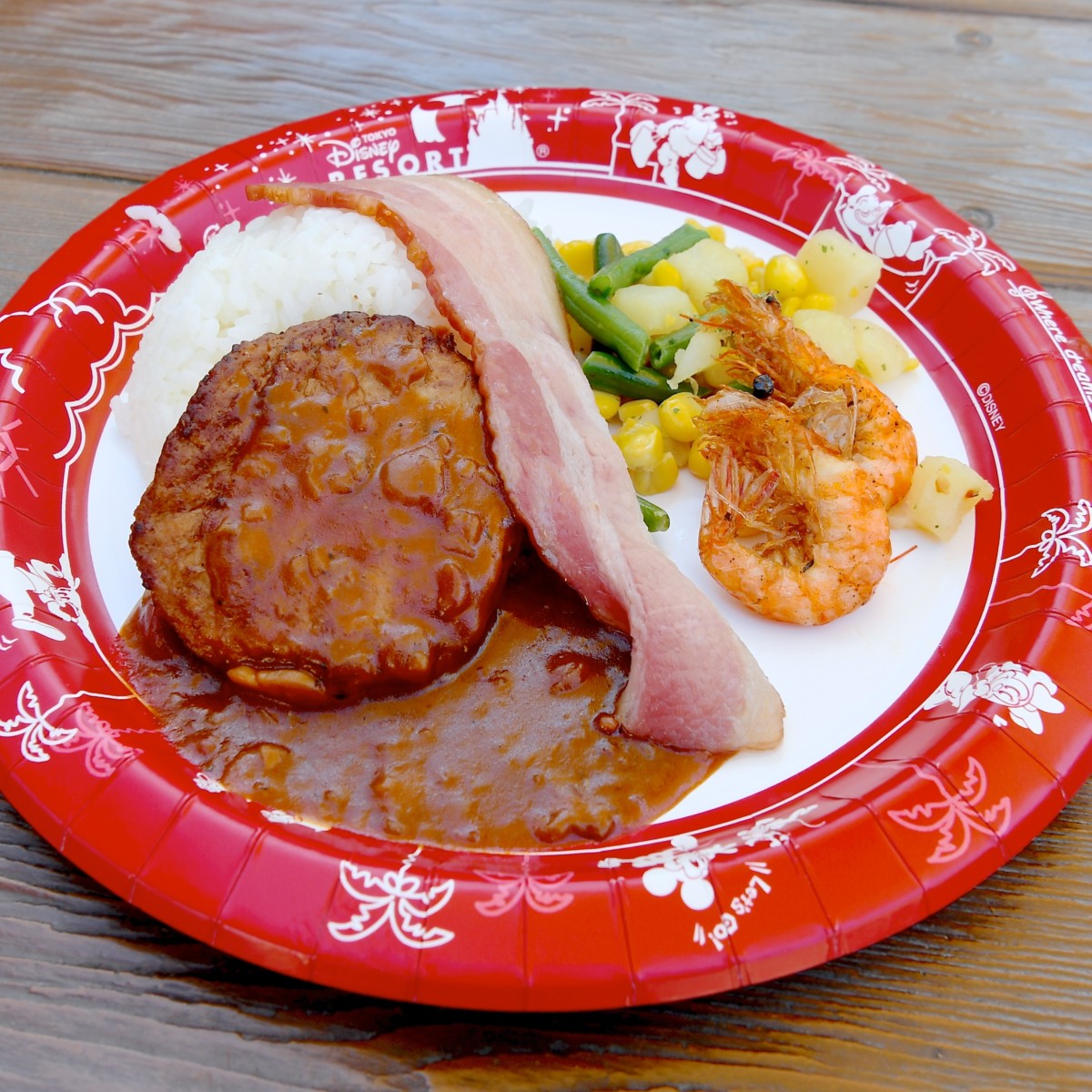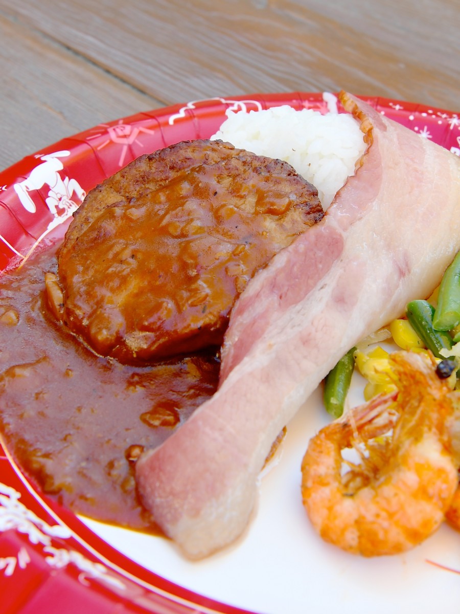 メインはBBQデミグラスソースがたっぷりかかったハンバーグとベーコン、シュリンプ、ライス添え。