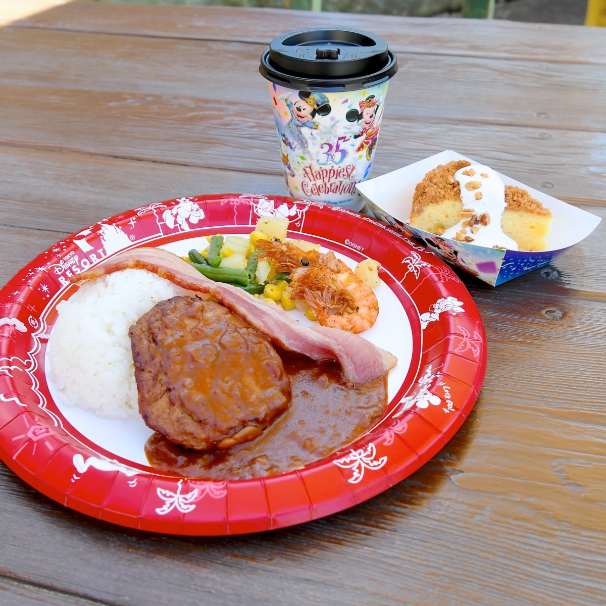 ハンバーグ BBQデミグラスソース ケイジャンシュリンプ、ベーコン、ライス添え ・アップル&シナモンのクランブルケーキ ・ソフトドリンクのチョイスのセット。