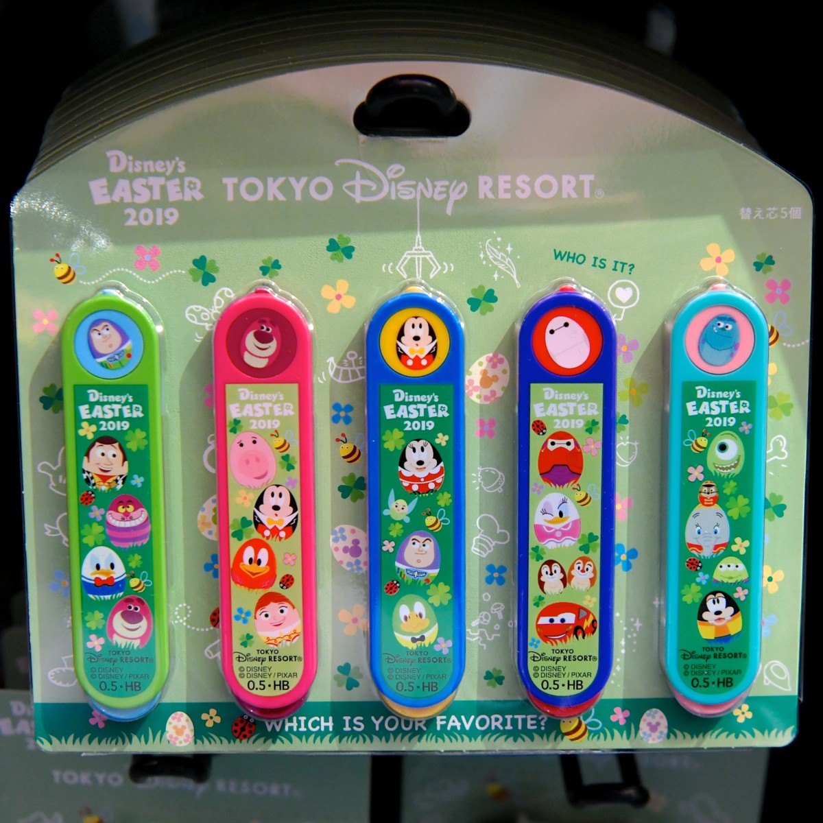 ミッキー、ベイマックス、サリー、バズ・ライトイヤー、ロッツォのマスコット付きボールペンセット。