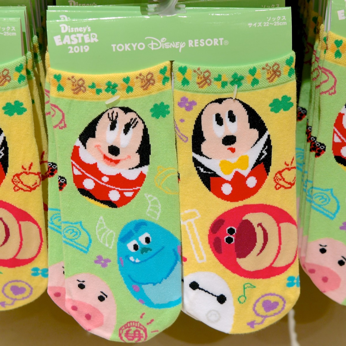 ミッキー、ロッツォ、ベイマックスデザイン、ミニー、サリー、ハムデザインの靴下。