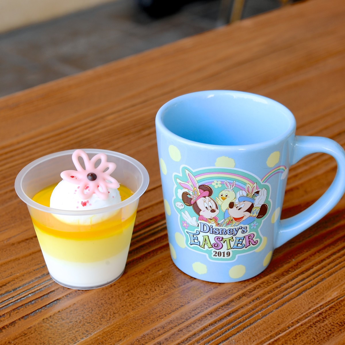 新ショー「Tip−Topイースター」のコスチュームを着たミッキーとミニー、うさピヨがデザインされたスーベニアカップ付きデザート。