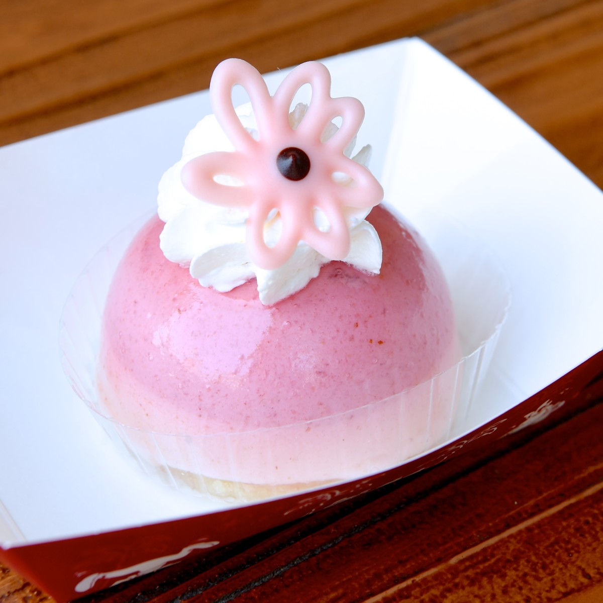 ふんわりスウィートなムースにホイップクリーム、お花型のチョコレートがトッピングされています。