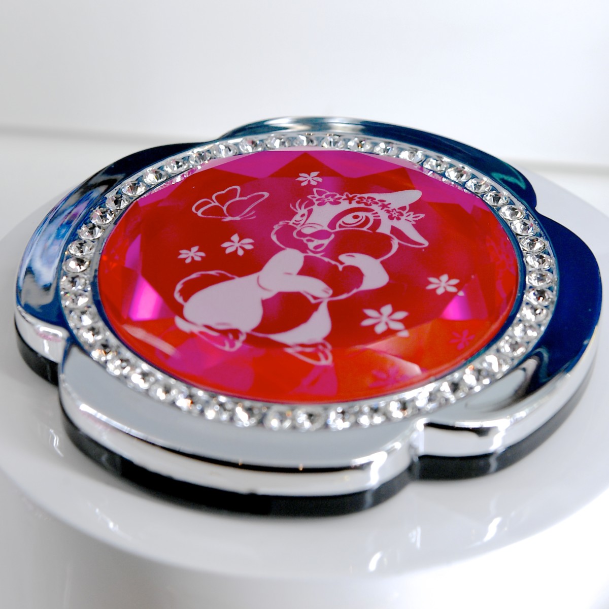 アニメーション映画『バンビ』に登場するとんすけのガールフレンド、ミスバニーがデザインされたお花の形がかわいいピンクのコンパクトミラー。