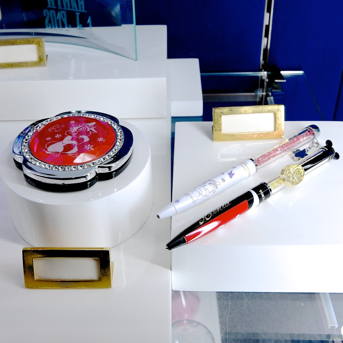 東京ディズニーランドのガラス専門店「ガラスの靴」「クリスタルアーツ」、東京ディズニーシー「アグラバーマーケットプレイス」では、ディズニーキャラクターモチーフのアクセサリーやボールペン、グラス、置物など様々なアイテムを販売中!