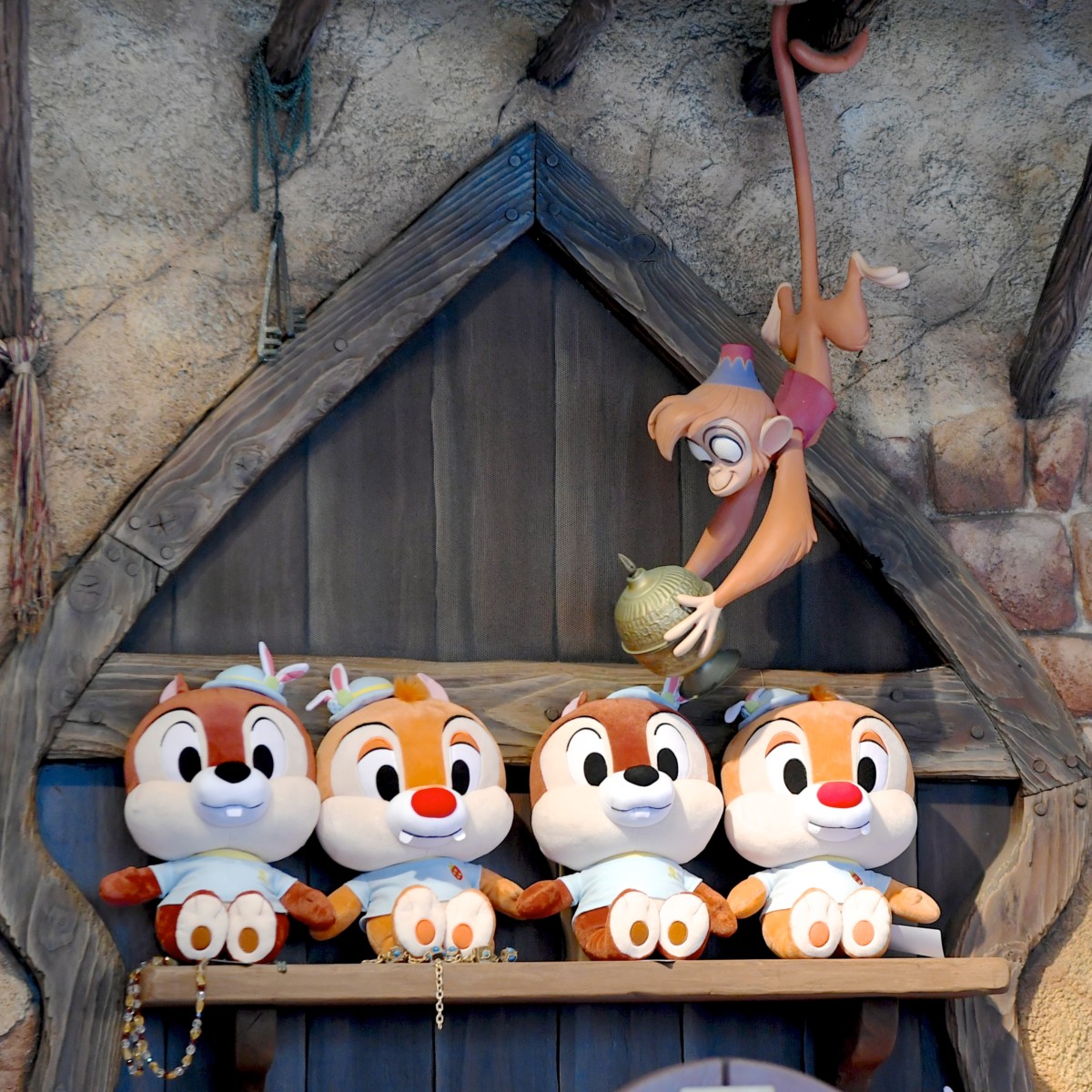 ドナルド&デイジー、チップ&デール、スティッチ&エンジェルのぬいぐるみが順番で登場するアブーズ・バザール。